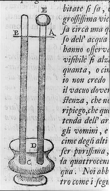 1644年6月11日,托里切利在一封写给友人的信中描述他们的意外收获:在一端封闭的玻璃管里装满水银,用手指堵住开口的另一端倒着置放于盛有水银的盆子里。放开手指后,少许水银会从管中往外流出,但很快即停止不动。管子里剩余约76厘米高的水银不再外泄。水银柱的上方是封闭的玻璃管,内部看起来空无一物。
