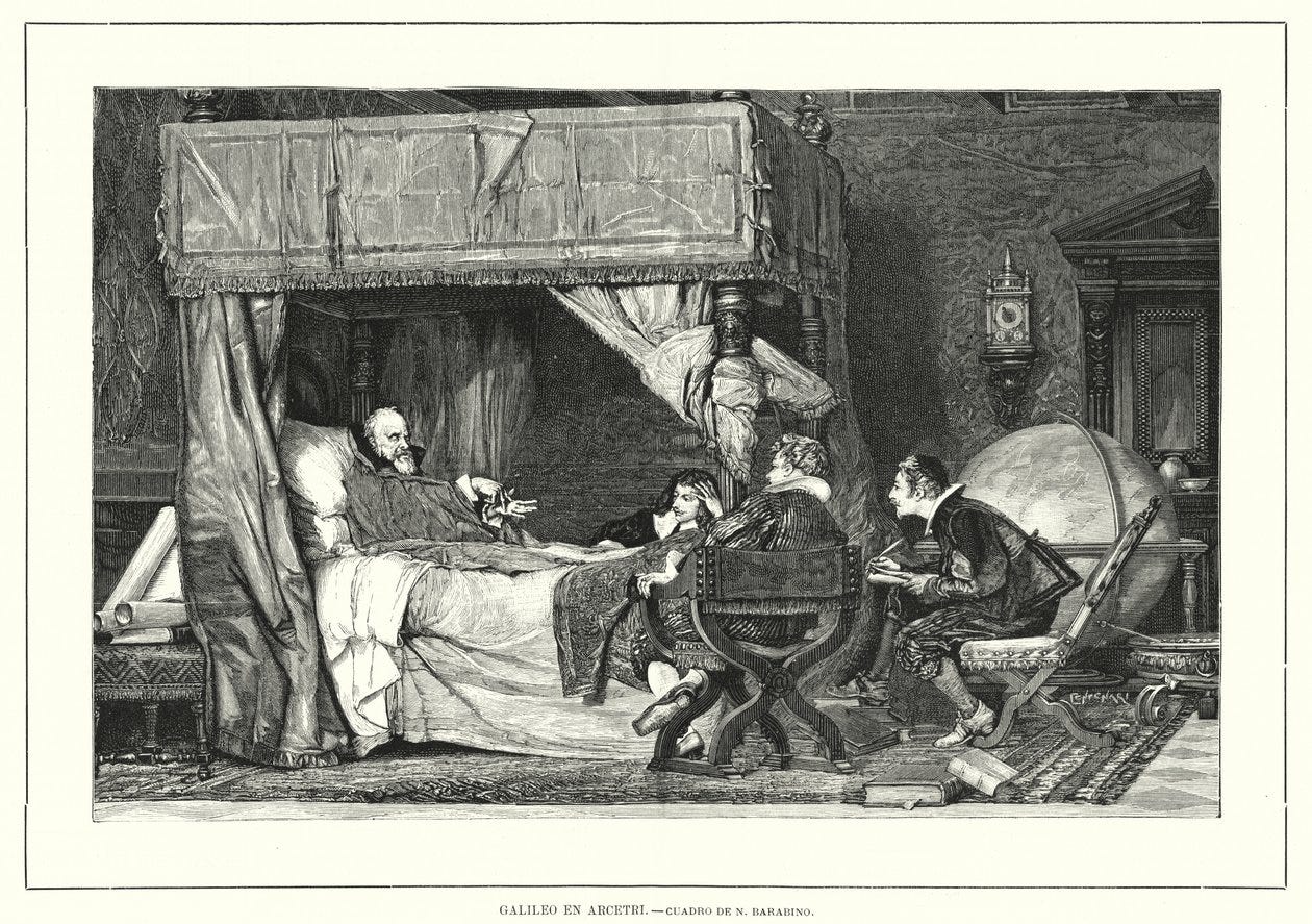托里切利不远百里前来时见到的正是已经在软禁中生活八年多的伽利略,一个77岁高龄、双目失明卧床不起的耄耋老者。1642年1月8日,伽利略在托里切利抵达佛罗伦萨仅三个月时辞世。
