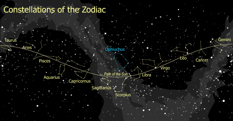 虽然白天看不到星星,希腊人也早已知道那只是太阳光过于强烈的效果。布满星星的天球仍然在太阳背后,在日出、日落之际隐约可见。太阳相对于天球的位置也可以如此辨认,比如尼罗河泛滥前太阳与大犬座同升共落、希腊雨季到来时太阳又在与金牛座相伴。这些现象也说明太阳的运行不与天球同步,会在不同时候出现在不同的星座之前。经过长时间的观察积累,太阳的行踪昭然若揭:每天,太阳大致伴随着天球由东向西,只难以觉察地慢一点。这样,太阳看起来在同一个星座“里”停留很多天。但日积月累,它逐渐落后,从一个星座挪到后面的一个。当太阳落后整整一圈回到最初的星座重头再来时,人间便过了一年。这一年里,太阳在天球上经过的路径叫做“黄道”(ecliptic),其中共有十二个星座,俗称为“十二宫”。它们首尾相连成绕地球一周的“圈”(zodiac)。“星相学”(astrology)由此而生:一个人出生时太阳所在的星座决定他的性格和命运。