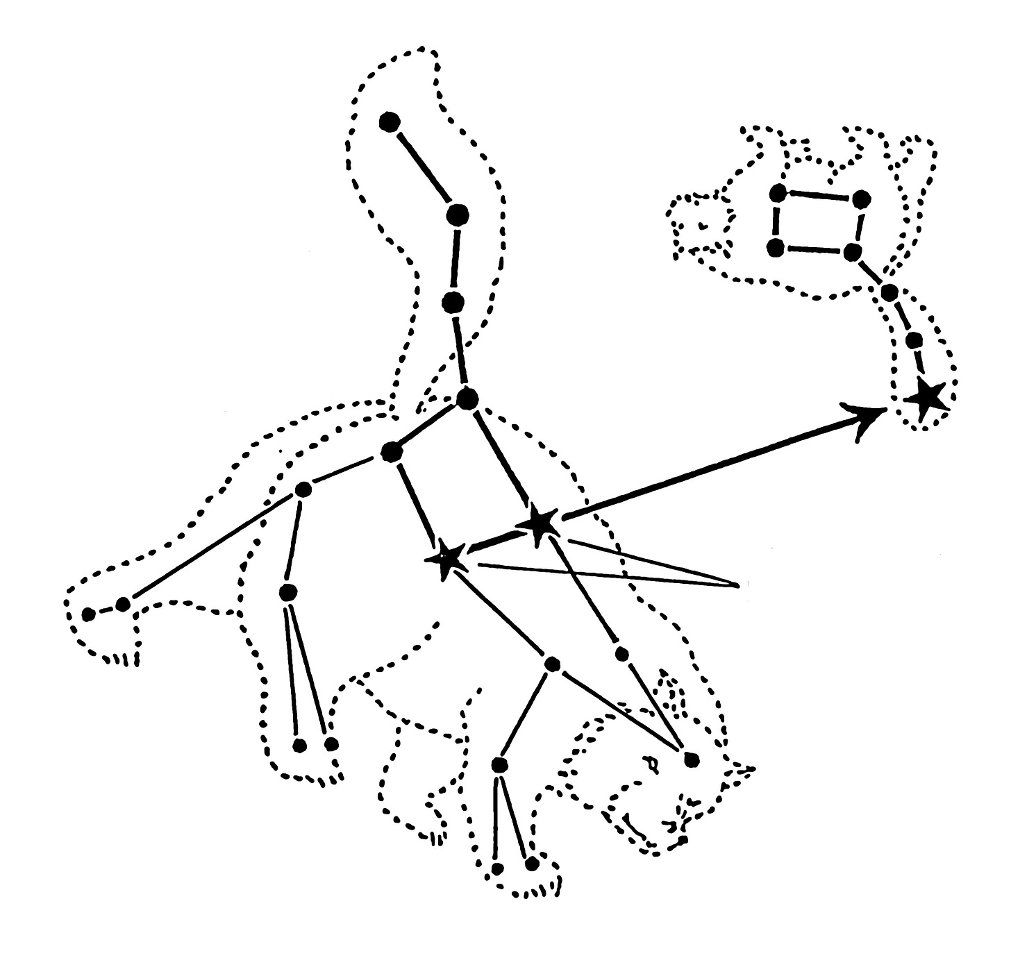 虽然不如天狼星明亮,“北极星”(Polaris)在夜空中同样出类拔萃。它属于紧挨着“大熊星座”(Ursa Major)的“小熊星座”(Ursa Minor),位于小熊的尾巴尖端。那两只熊原来分别是宙斯的情妇和私生子,因遭正宫嫉妒被流放天涯。熊的背部和尾巴形成容易识别的长勺状,被昵称为“大杓”(Big Dipper)和“小杓”(Little Dipper),或者大、小“北斗星”。