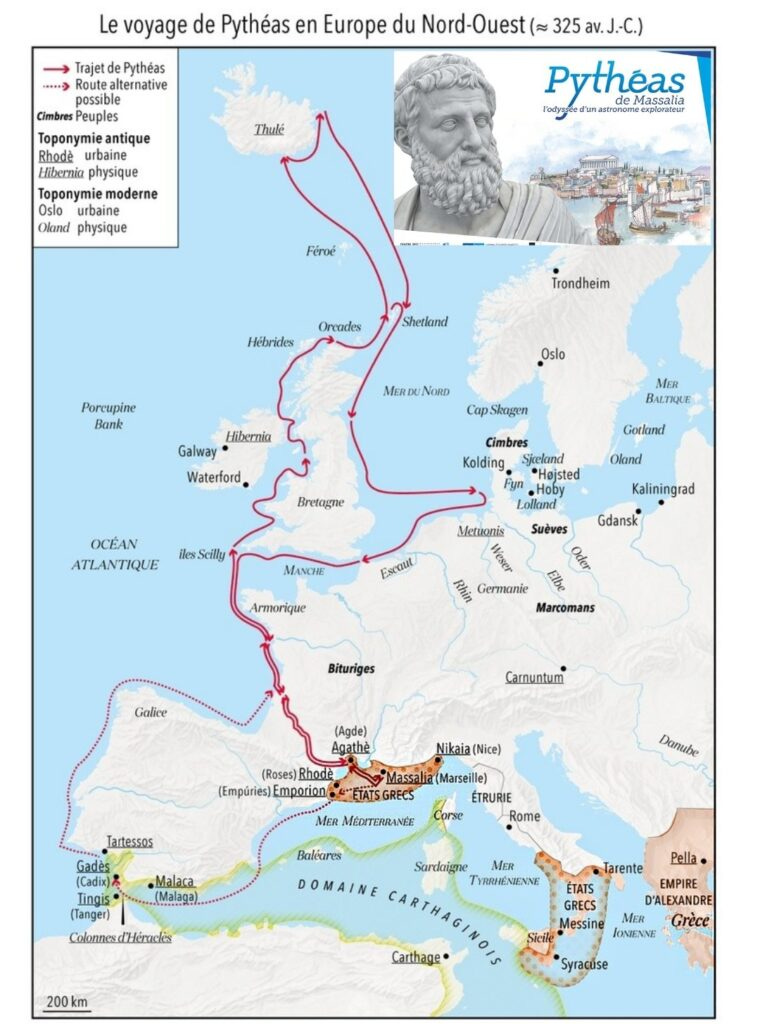 在未知海域探险的皮西亚斯更没有办法测知自己所在的经度。为了获取中午时的阳光照射角度,他必须在午时前后多次测量,选取晷针影子长度的最小值。这个操作无法在颠簸的船中进行,只能停靠海岸或岛屿登陆完成。可惜这个线索对喜帕恰斯毫无帮助。几百年后,人们终于实地追溯皮西亚斯的足迹,普遍认为他到达的终北之地是冰岛,其北岸位于北极圈边缘。他很可能还曾继续驾舟北上,观赏到独特的午夜阳光,成为第一个走进北极圈的“文明人”。不过也有人认为皮西亚斯的航向严重偏东,抵达的是挪威北部的海岸。