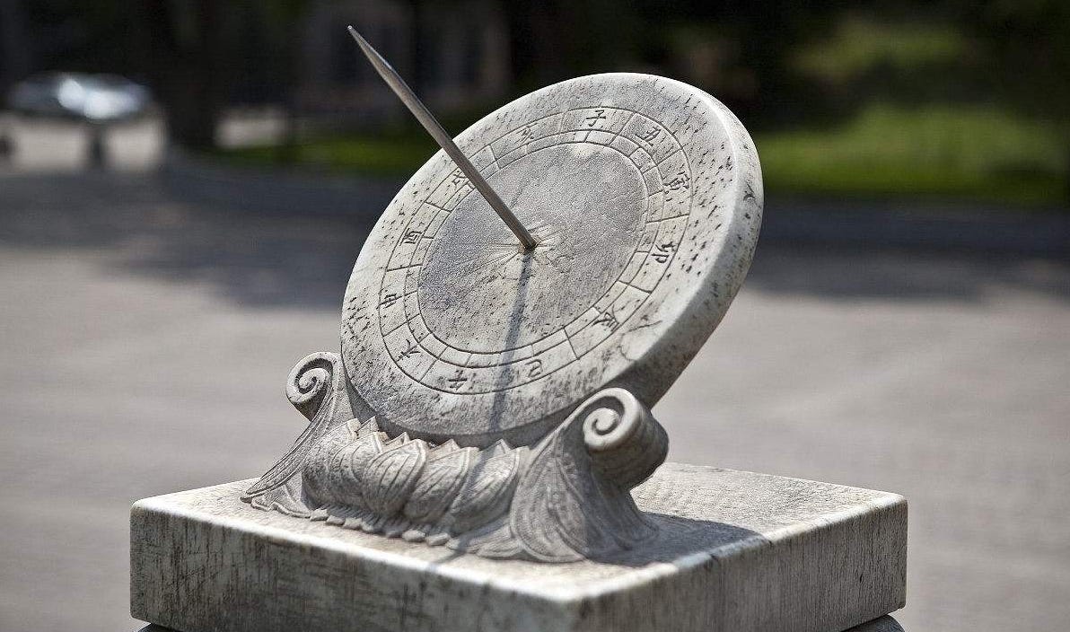 竖直的晷针在测量纬度、正午及季节更替上大显身手,用于日常计时却不尽人意。太阳每天从东到西在天上匀速运转,晷针影子也在地面相应转动。但由于所在地纬度造成的阳光照射角度变化,晷针影子的速度每日每时不同,在正午那一刻之外难以指示时间。这个困难可以通过改变晷针的角度克服。将晷针设置在一个与地面夹角等同于当地纬度的斜面上,同时让晷针保持与斜面垂直并指向正北。晷针这时与天球的旋转轴平行,影子会随太阳在斜面上匀速转圈。在斜面底座将一个圆圈平分为24等份,影子走过每一份的时间便是一小时。这是“日晷”(sundial),人类最古老的“时钟”,早在喜帕恰斯定义纬度之前已经出现。不过,日晷只能在有阳光的时候使用。它的影子不再有明显的四季之分,无法像晷针那样用作日历。