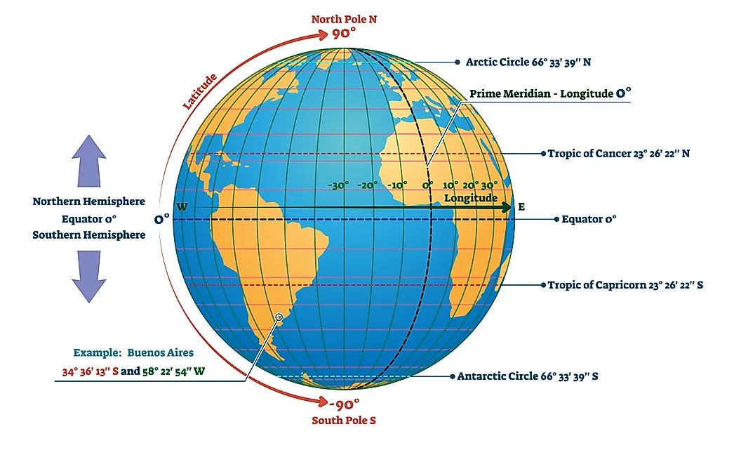 平行线只能标识南北方位。地球在东西方向没有北极那样的现成参考点,但也能依照太阳相区分。因为太阳大致由东至西地绕地球运行,地面上同时看到晷针影子最短之正午的不同地点必在彼此的正南或正北,恰似亚历山大港和阿斯旺。这些地方的连线延长后通过南北两极,都是环绕地球的大圆。埃拉托色尼谓之“中午线”(meridian),也选取一些经过大城市的线作参照。