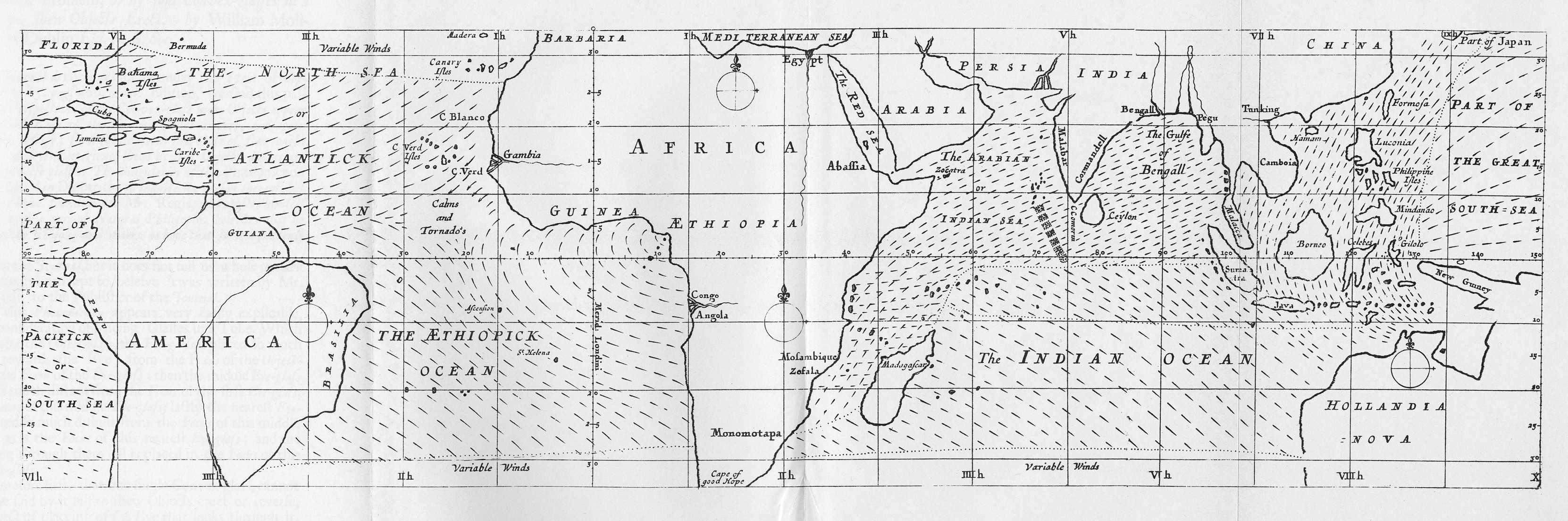 在地图日益完善的十七世纪,人类由此有了第一份依照实际证据绘制的气象图。哈雷以由细而粗的短线标志风向,生动地展现信风在各大洋的分布。