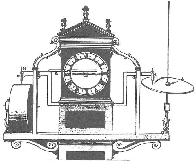 牛顿的《自然哲学的数学原理》出版时,虎克刚过半百之年。他在王家学会的薪金翻了一番,却也清楚地看到自己在英国学界的权威地位已经一去不复返。自协助波义耳制作气泵成名,虎克一直担任实验员,兢兢业业地完成学会交给的每一项任务,包括日常气象数据的采集和记录。1679年时,他在雷恩的建议下经过十多年的不懈努力成功创制“天气钟”(weather clock),用摆钟带动温度计、气压计、湿度计、风速计和雨量计,每隔十五分钟自动在纸带上记录读数。