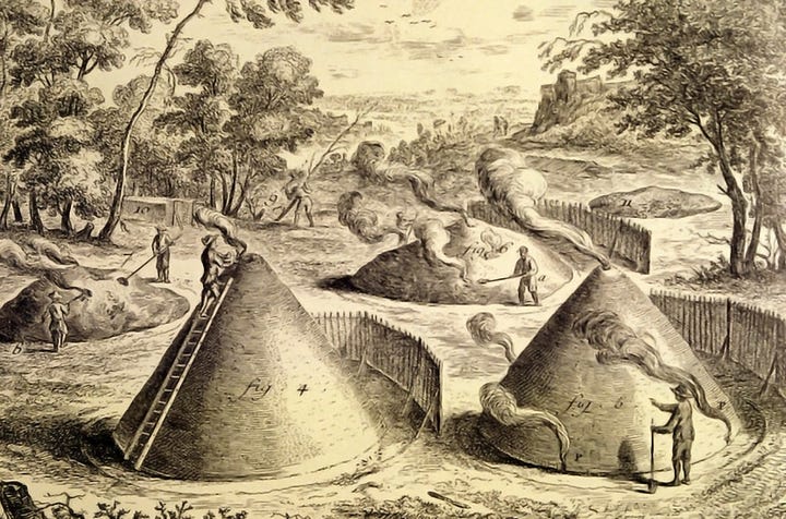 虽则众人拾柴火焰高,人们也很早学会将木柴堆放在不通气的泥窑里闷烧,得到的“炭”(charcoal)火力更为猛烈。炭火的高温足以冶炼出矿石内含的金属,辅佐人类告别原始的“石器时代”(Stone Age),逐步过渡至“青铜时代”(Bronze Age)和“铁器时代”(Iron Age)。凭借锋利的刀剑和坚固的斧、犁、锄、镢,人类由依附于大自然的受庇护者摇身一变为改造大自然的主人翁,开启吉尔伽美什式翻天覆地的农业革命。