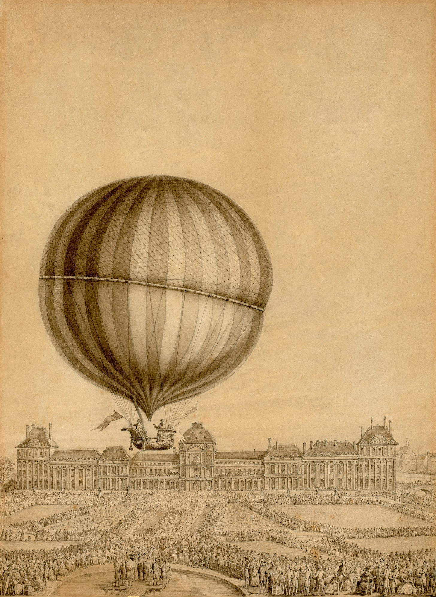 德罗齐耶和达兰德斯成功飞行仅仅十天后,巴黎再次倾城而出,在卢浮宫前的杜乐丽花园(Tuileries Garden)观享又一载人气球的起飞。那是物理学家查理(Jacques Charles)设计的气球,比孟格菲兄弟的明显小一号,升空后飞得又高又远。病中的富兰克林坐在马车里用望远镜眺望,也很快失去气球的踪影。