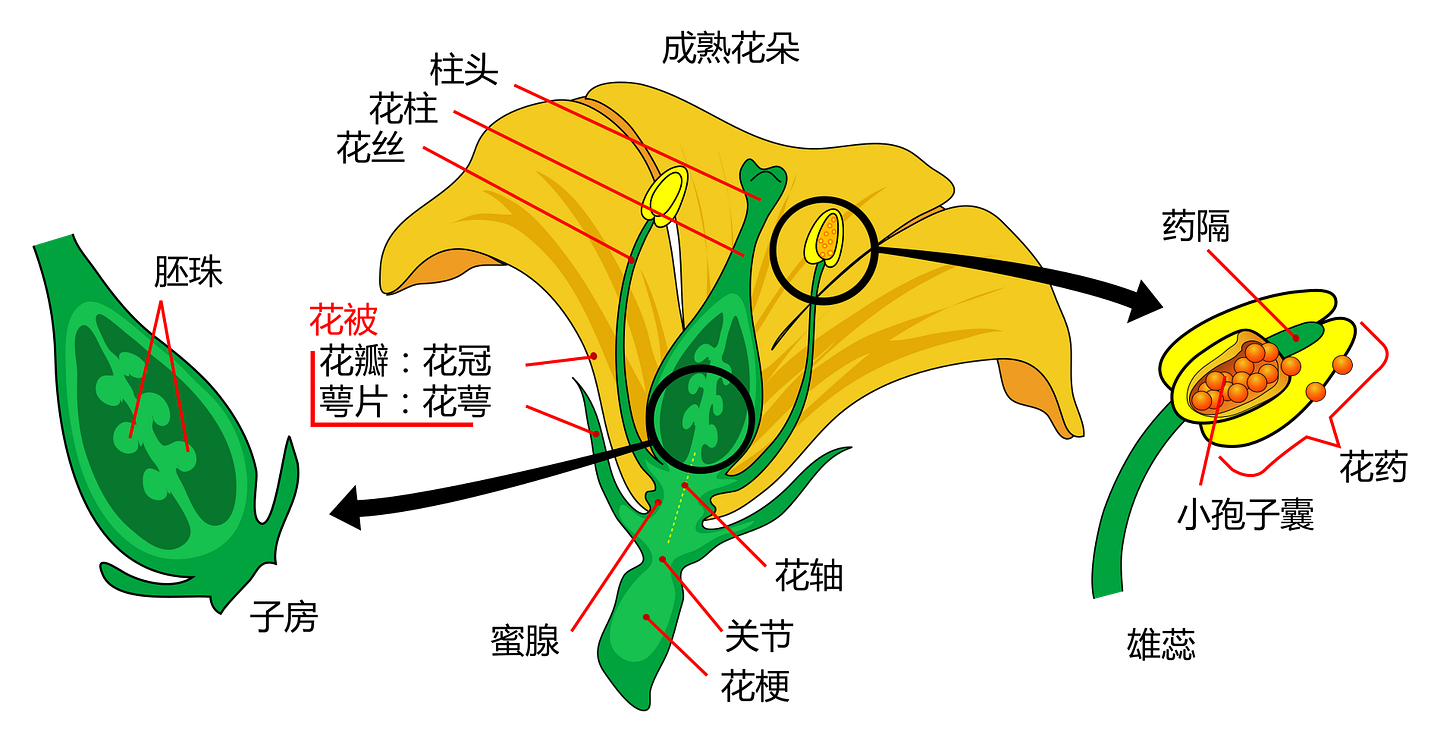 植物也有性,或者说有着与动物性功能相应的两种性器官。它们都存在于花朵之中。虽然看起来姹紫嫣红千姿百态,花的结构其实大同小异。在绚丽多彩的花瓣中间是许多个分成两类的花蕊:一类能产生花粉,另一类则会接受花粉然后孕育出种子。这个机制与动物的两性交配如出一辙,花粉正相当于动物的精子。因此,植物的花蕊按其功能分别被称为雄蕊和雌蕊。雄蕊中有产生花粉的花药,雌蕊中则有接受花粉的柱头和孕育下一代的子房。