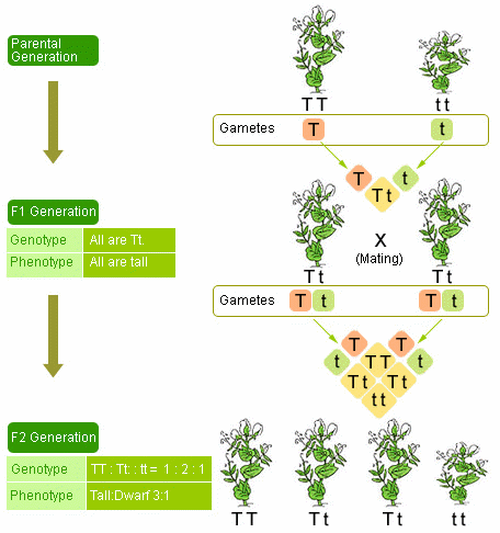 接下来,孟德尔假定豌豆的花药产生花粉时,它所有的两份因子只有一份会进入花粉。相应地,子房中的卵子也只会获得一份因子。当花粉与卵子结合形成下一代胚胎时,来自父亲花粉的一份因子与来自母亲卵子的另一份因子合起来再度组成新一代豌豆的两个因子。当高茎豌豆的花粉被授予低茎豌豆时,胚胎从父亲继承一份高茎因子,从母亲得到一份低茎因子。如果反过来用低茎豌豆的花粉授予高茎豌豆,胚胎则从父亲继承一份低茎因子,从母亲得到一份高茎因子。这样,第二代豌豆都有着一份高茎因子一份低茎因子,没有区别。所以,他实验里的授粉方向对后代没有影响。