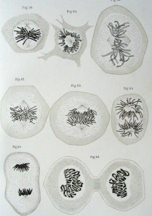 在那同时,人们也在更清晰地认识细胞。将生物标本的切片浸泡在液体里观察时,其中的细胞依然富有生命力:一个细胞能够分裂成两个一模一样的细胞。持续的分裂使得细胞数目指数般增长。那正是动物和植物生长的机制。