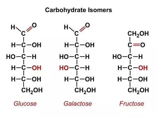 与烃一样,糖分子的主干也是碳链,只是与碳相连的氢中有些被置换为同为一价的羟基。它们也有着花样繁多的同分异构体。比如植物在光合作用中合成的葡萄糖就是有着六颗碳原子的单糖——“己糖”(C₆H₁₂O₆)——的多种异构体之一,另外还有水果等食物中常见的果糖(fructose)等等。它们的碳链既可以是直线,也可以头尾相连成一个环。费舍尔在实验中发现、发明并提纯各种试剂检验这些异构体的区别,同时选取合适的催化剂人工分解、合成这些有机分子。
