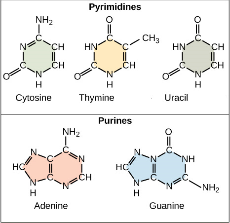 在科赛尔和其它实验室的协同努力下,这些化合物的成分和结构在19世纪末陆续被解析。它们都由碳、氢、氮和氧原子组成,具备极为接近的化学性质。较为简单的嘧啶有着与苯相同的环状结构,只是环链中两个碳原子被氮原子替代。嘌呤稍微复杂一些,它们的环还紧连着另一个稍小一点的五边环。
