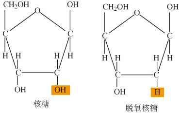 他一直坚持着的直觉没有错。那的确不是六颗碳原子的己糖。与酵母核酸中的核糖一样,这种糖有着五颗碳原子。但它却不是同样的核糖,甚至压根不能算是糖。这个化合物的分子中比核糖少一颗氧原子,挂在碳环上的一个羟基(-OH)变得只是一颗孤零零的氢原子。这样,分子中氢原子与氧原子的比例不是二比一,也就不再是碳“水”化合物。利文只好把这个新奇的化学物(C₅H₁₀O₄)命名为“脱氧核糖”(deoxyribose)。
