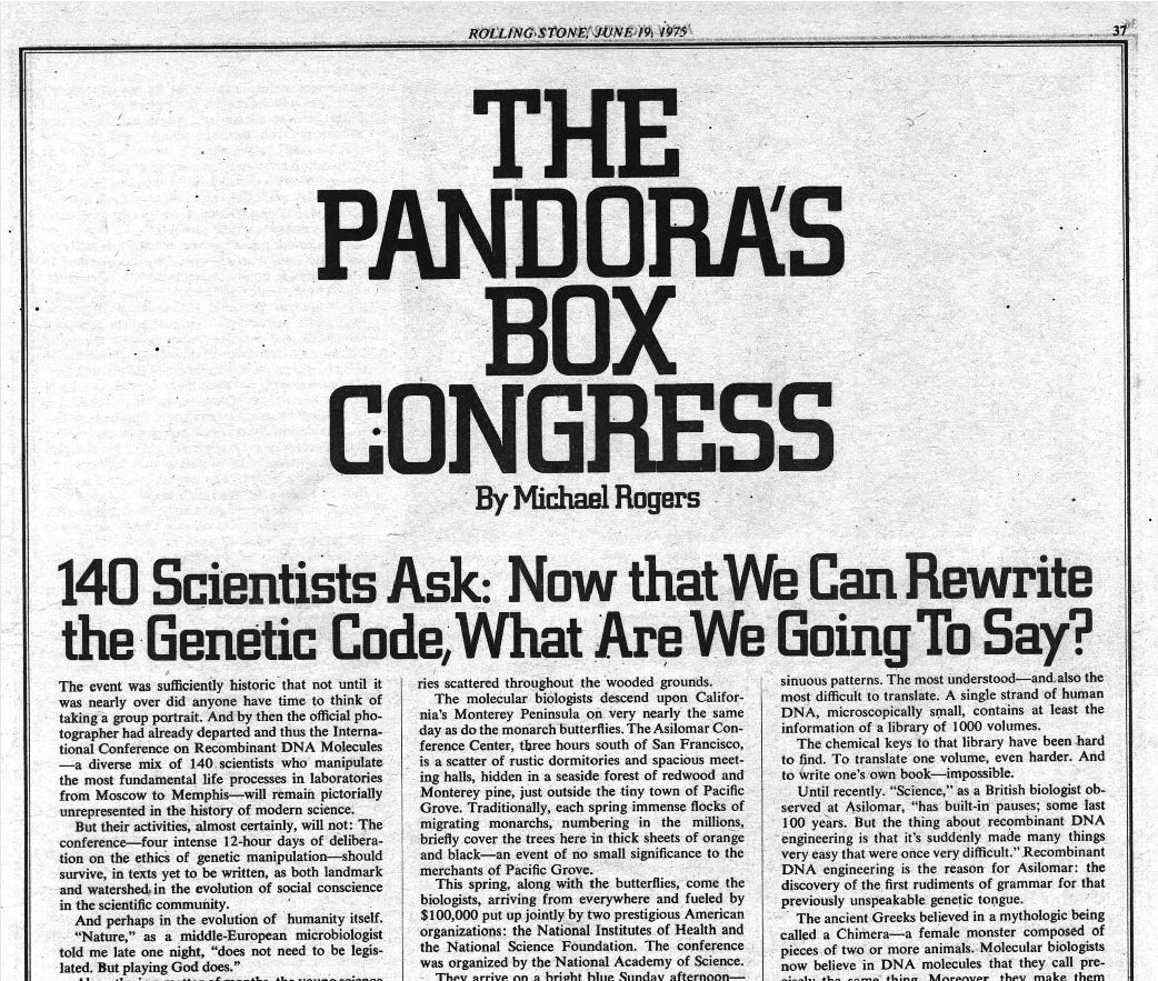 然而,生物学家也在1970年代面对自己的潘朵拉盒子。好在那是一个和平时期,即使处于冷战对峙中的苏联和美国科学家也能在同一个会场里促膝交谈共商大计。阿西洛马会议因而成为科学界史无前例的里程碑:世界各地的科学家在这次“议会”中齐聚一堂畅所欲言,以民主表决方式自觉自愿地为自己的科研工作加以限制。他们的行动既出自作为科学家的社会责任感,也是希冀能以行业自律的方式避免各国政府进一步插手科学家自由自在的科研事业。