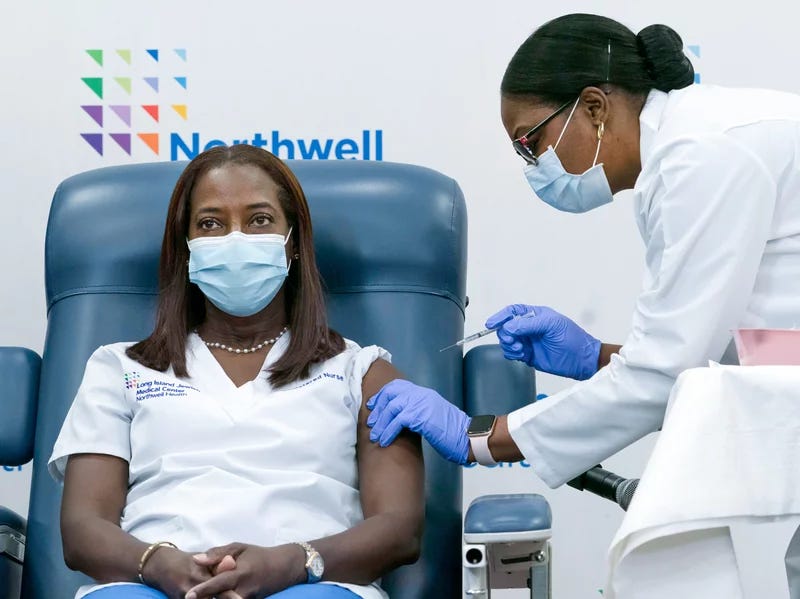 12月14日,长岛一位名叫林赛(Sandra Lindsay)的护士挽起袖子,让另一位护士为她注射了来自辉瑞的疫苗。她是正式接种新冠疫苗的第一人。在现场直播中,林赛平静地表示,“作为护士,我在科学的指导下工作。所以,我信任科学。”