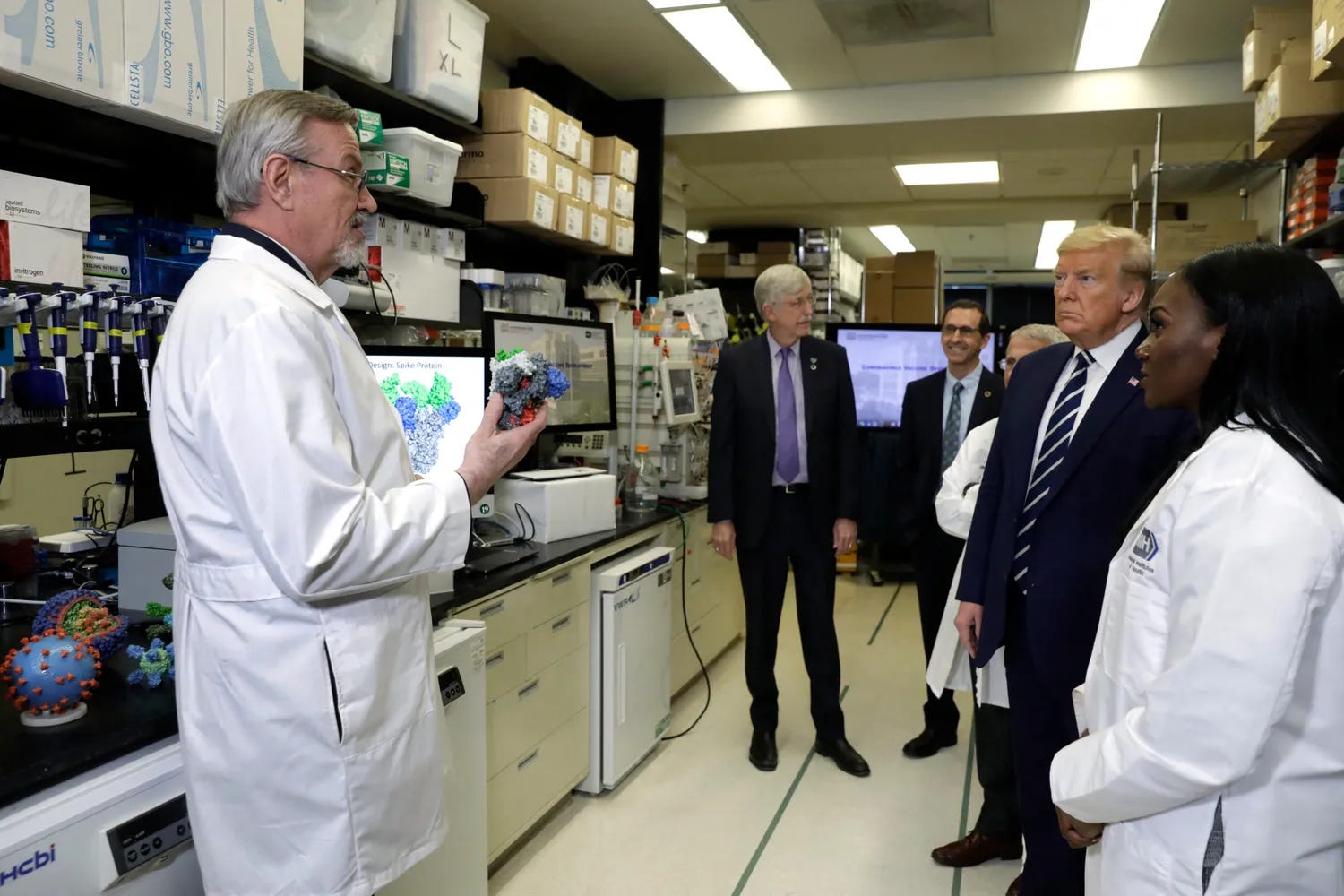 第二天,川普在国立卫生研究院主任柯林斯的陪同下特意来到疫苗研究中心参观,听取福奇和格雷厄姆的汇报和讲解。