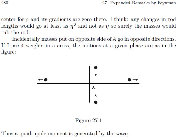 不料,费曼这一番天真的外行话倒还真让一众引力学家脑洞大开,几乎立刻就接受了引力波的现实。这个假想实验被称之为“粘珠论”12,后来被用于证明引力波的正式论文中。