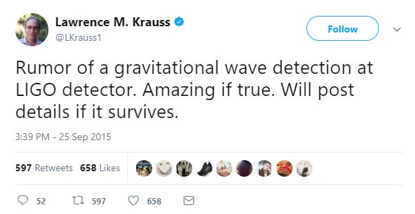 2015年9月25日,亚利桑那州立大学的物理学家克劳斯1教授在社交媒体推特(twitter)上冷不丁地发出一条消息,说有传言LIGO已经探测到引力波,如果确实的话会很惊人。克劳斯是著名的科普作家,他在推特上拥有近49万粉丝。