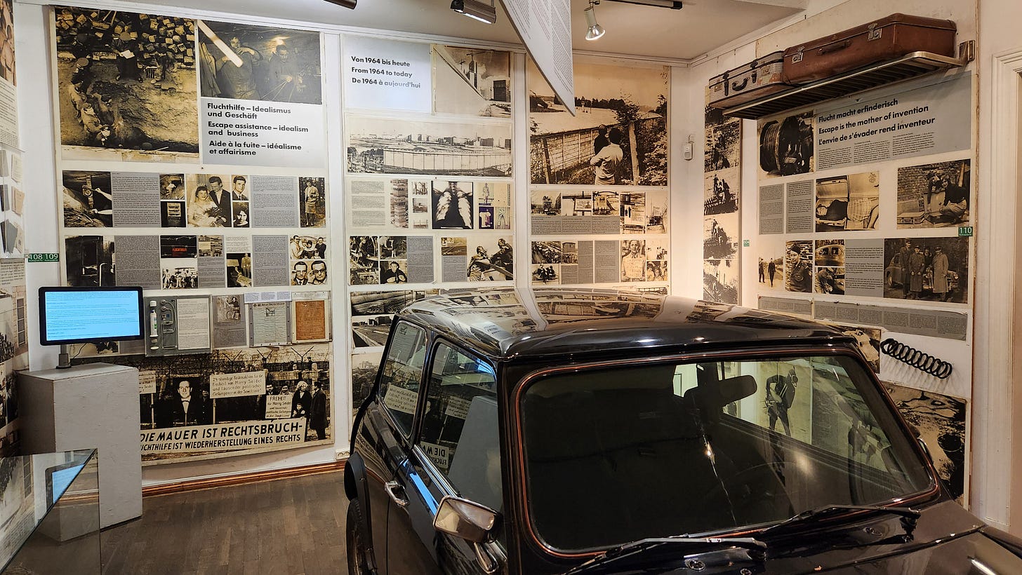 肯德基的楼上是柏林墙博物馆,从窗口可以俯瞰往日的检查站地形。博物馆里展出大量东柏林人近三十年前赴后继“肉体翻墙”所用的实物和照片。它们体现出非凡的勇气和聪明才智,更无情地揭露暴政之下走投无路的绝望。至少有140人在铤而走险时丧生。
