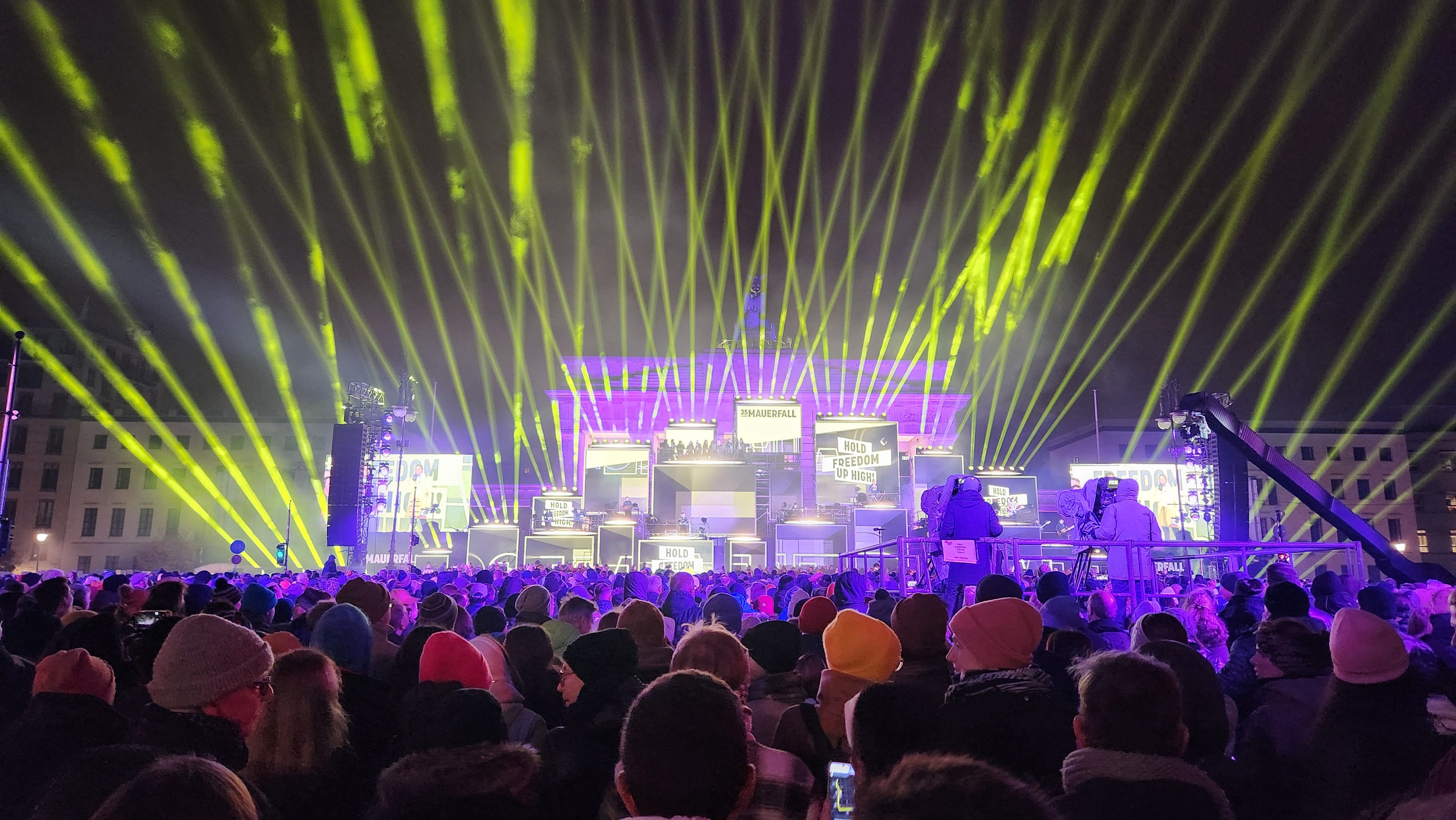 勃兰登堡门几乎被临时性的电视屏幕群遮掩。屏幕前则是大型乐队的演出舞台。从柏林火车站到到波茨坦广场到查理检查站,新柏林墙的沿途还有一系列的电视屏幕和乐队演出点。在纪念活动尚未开始的白天,屏幕上不停地播放着35年前的历史镜头。看着东德青年集体走上街头喊出“我们是人民”的震天口号,看着他们那个夜晚冲破障碍走向自由,看着大墙两边的亲友终于团聚拥抱,看着在墙上失去生命的名字一个接一个地出现,今天的柏林大街上不少人热泪盈眶。