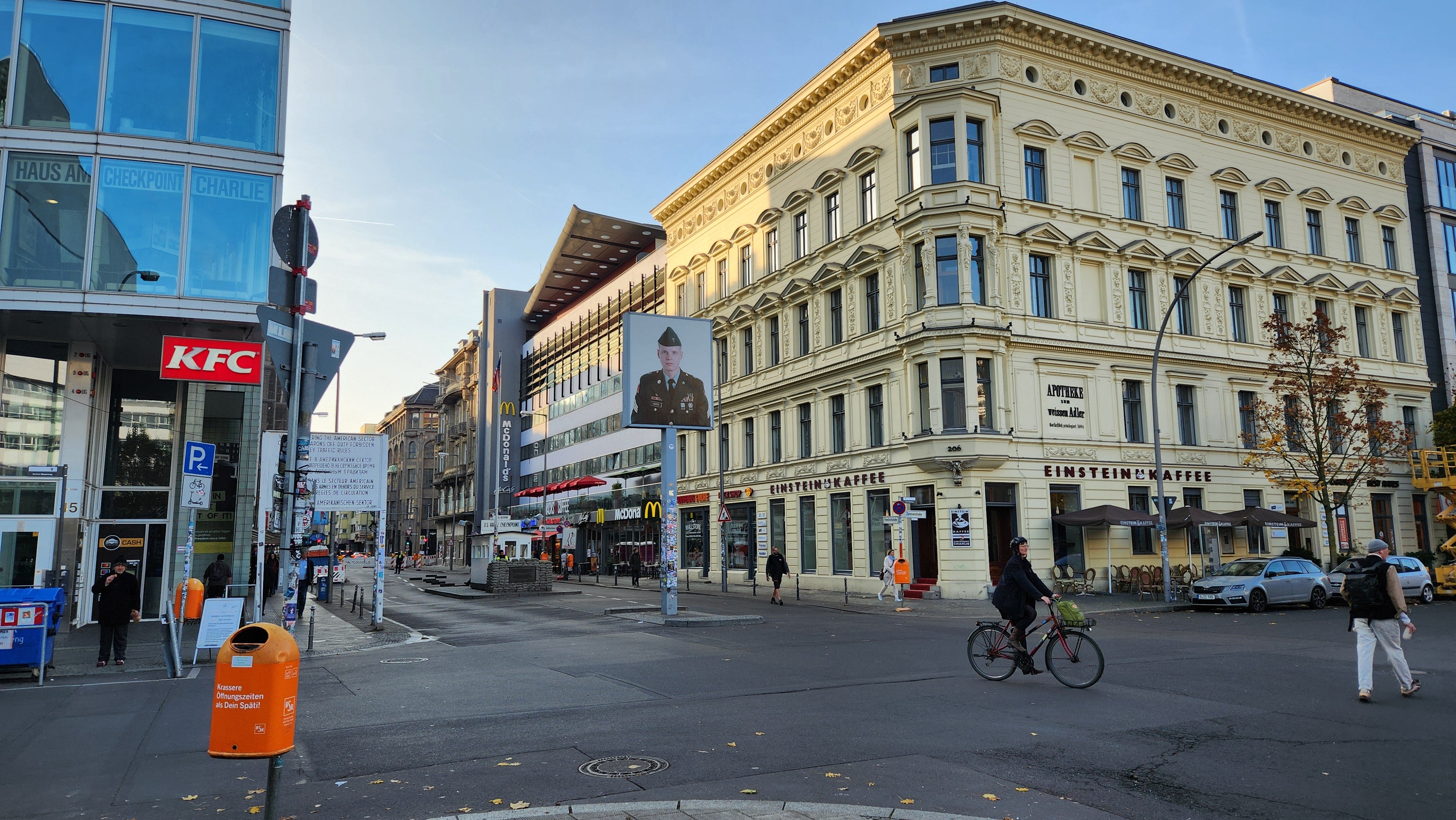 查理检查站是当年东西柏林之间的几个通行关口之一。美国和苏联的坦克曾在这里实弹对峙,第三次世界大战一触即发。今天的街口保留着美军执勤的小屋和沙包工事。不过更为显眼的倒是今日柏林街头的平常:肯德基、麦当劳和一家爱因斯坦咖啡店。