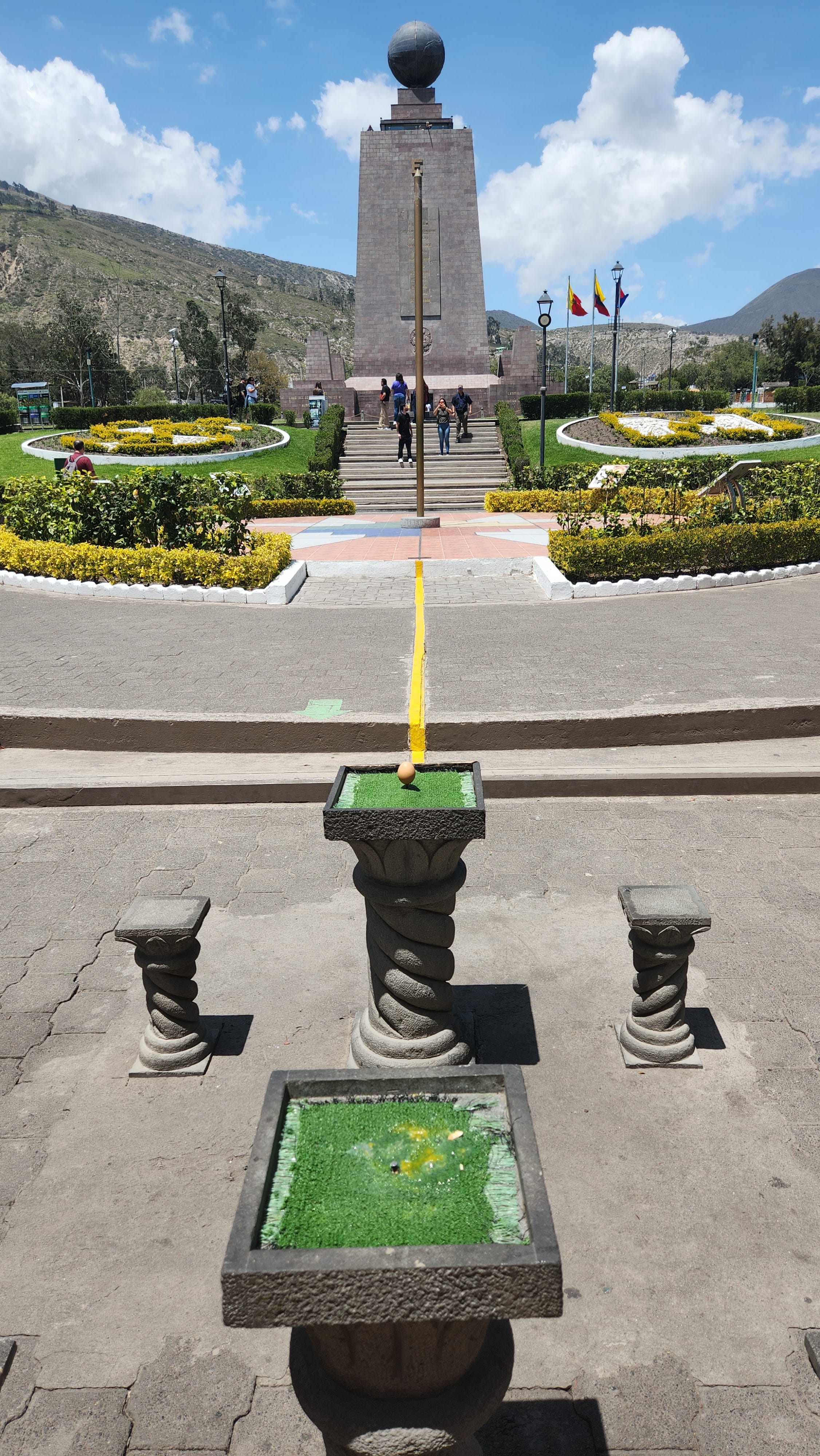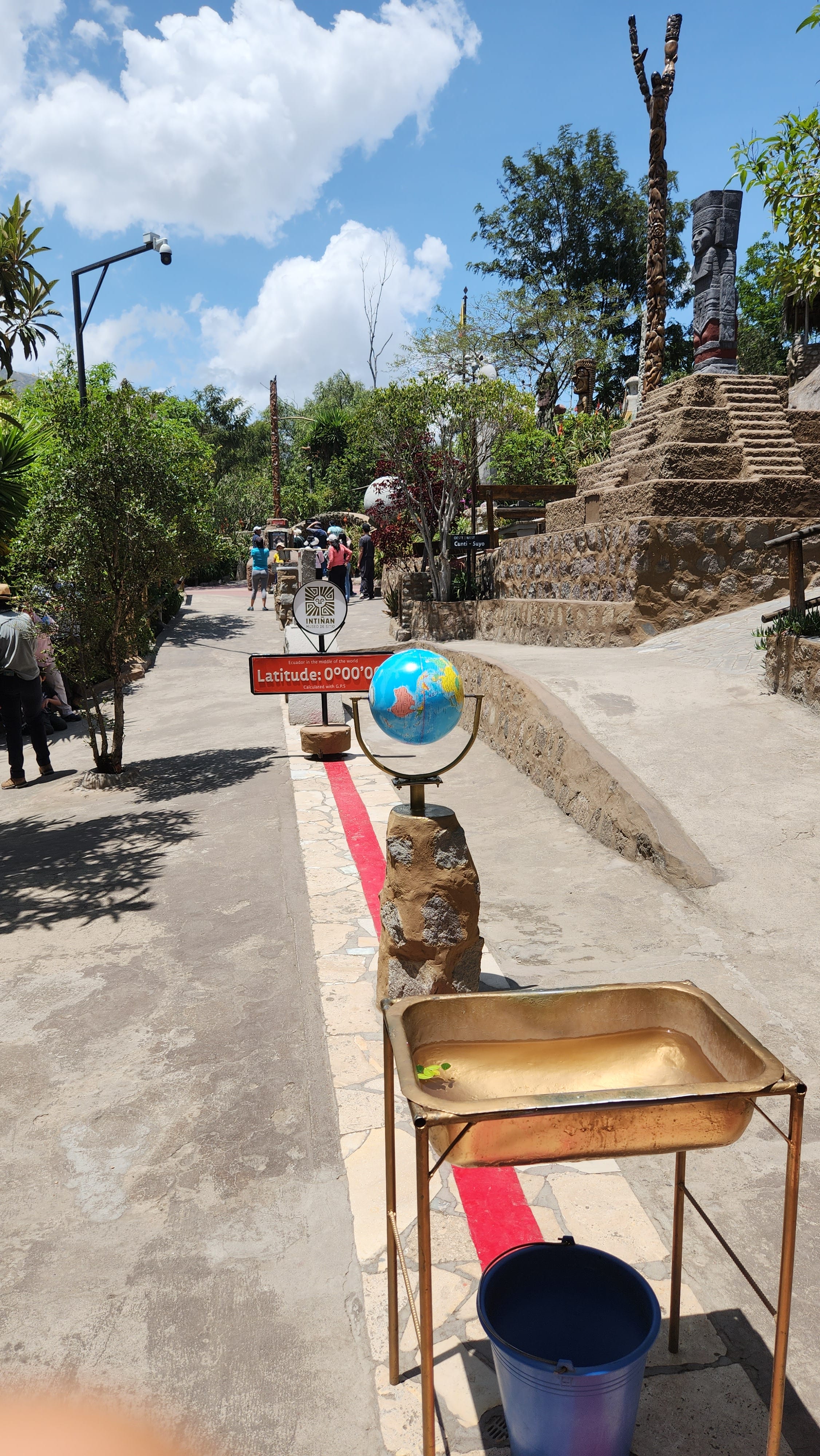 据介绍游客会在这里观赏导游演示的赤道特有奇景:位于赤道黄线上的水槽放水时直流而下没有旋转。将水槽挪开几步,就能看到北半球的水逆时针旋转而下。南半球正相反,呈顺时针旋转。可惜当日游客稀少,未能亲眼目睹这一场景。但在黄线上,游客可以亲手尝试将生鸡蛋竖立在细铁钉上。由于地球引力在赤道的“对称”,这个操作比其它地方容易做到。基于同样的理由,游客也能更容易地闭着眼睛脚踏黄线走时装模特的步伐。这些魔术式的伪科学表演远比科学的晷针更引人入胜。