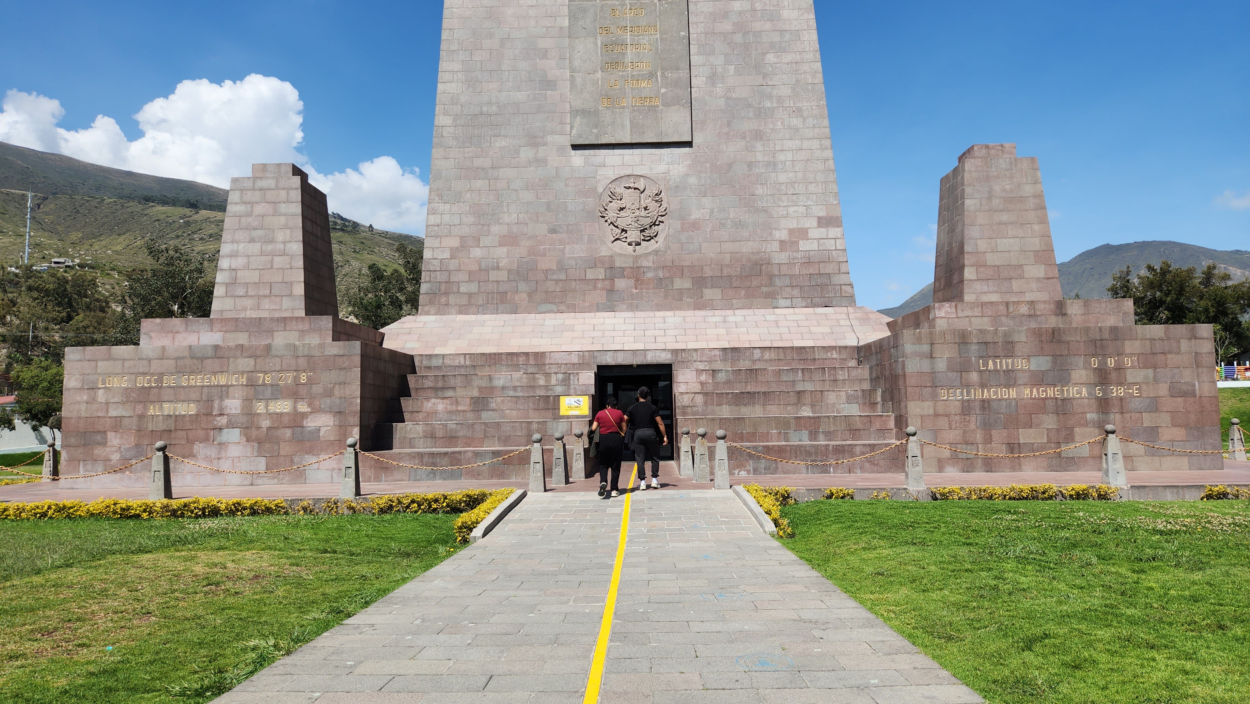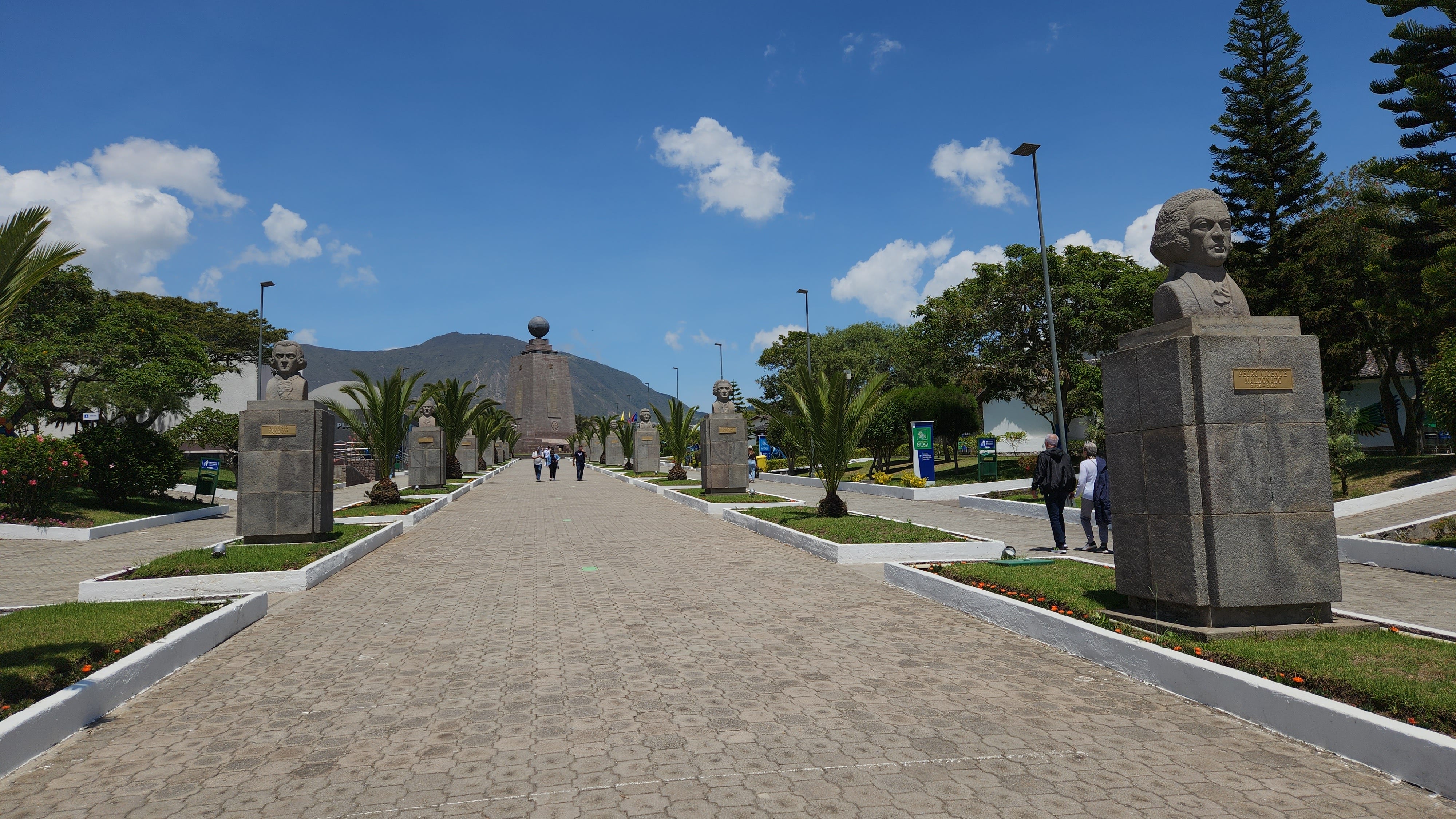 乘车来到这个胜地,首先看到的是宽广的大型停车场。购票入“城”后也是满目的开阔。十月末的基多处于旅游淡季,上午更是游人稀少,颇显荒凉。一条宽敞的步道通向引人注目的“赤道纪念碑”(Monument to the Equator),两旁列着法国远征队队员的头像。