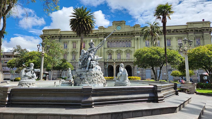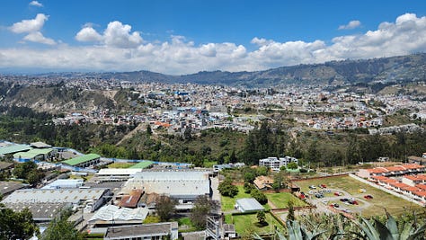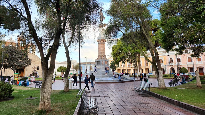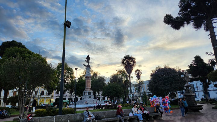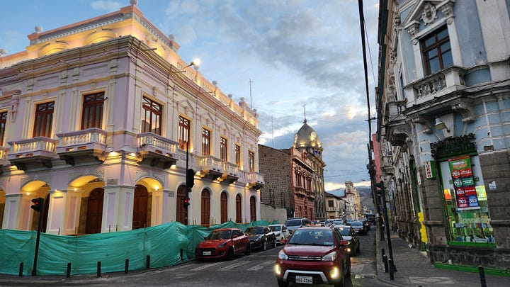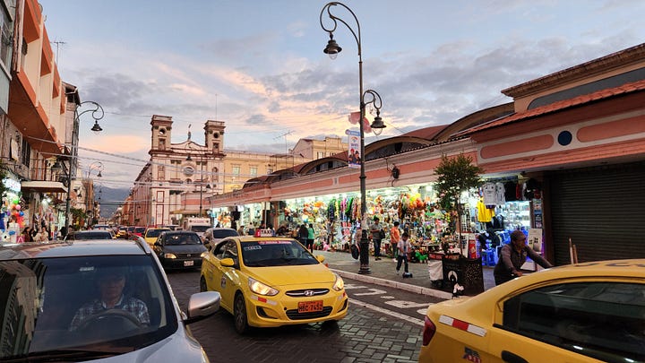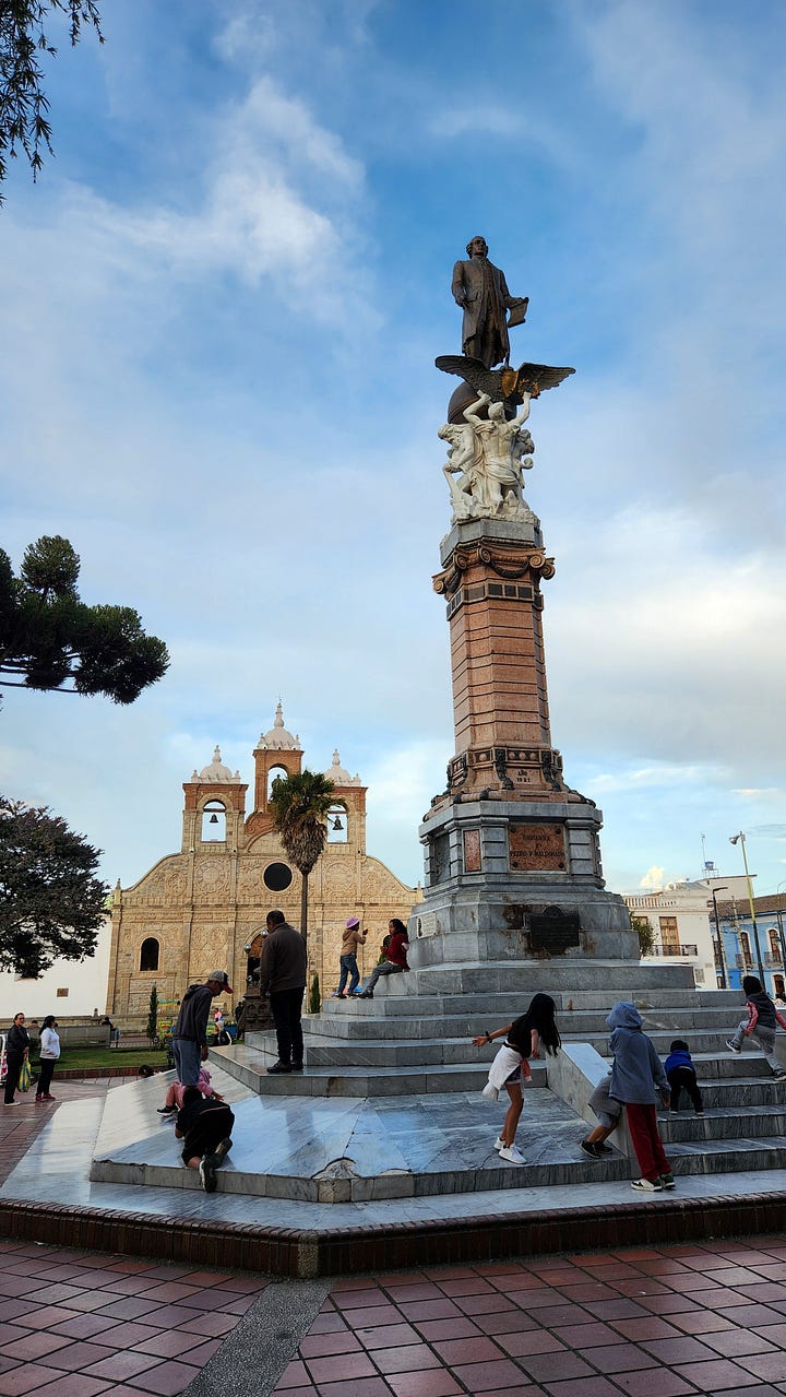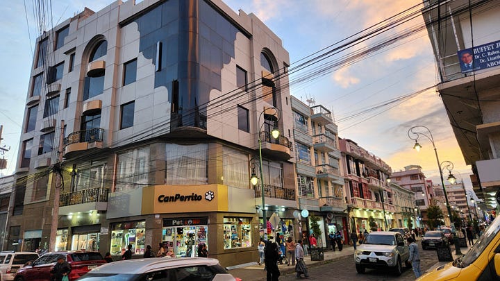 第三晚住宿的是距离钦博拉索山最近的小镇里奥班巴(Riobamba)。那是西班牙人在厄瓜多尔建立的第一个市镇,历史比基多还早几个月。不过1797年一次大地震将该镇夷为平地,今日所见均为其后重建的产物。洪堡几年后来访时,地震余波尚在,也是他研究地质地理的场所。重建后的里奥班巴美轮美奂,街边建筑色彩鲜艳各有特色。在晴朗的日子里,从镇上可以清晰地看到钦博拉索山的巍巍雪峰。当然我们没有这样的好运气,只能艳羡旅馆里展示的照片。