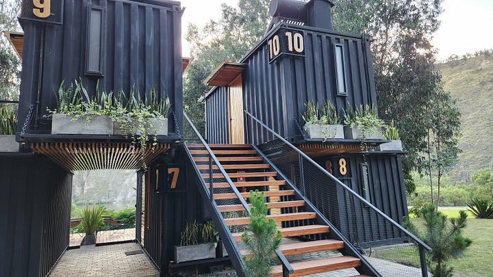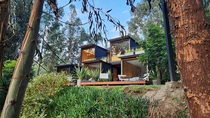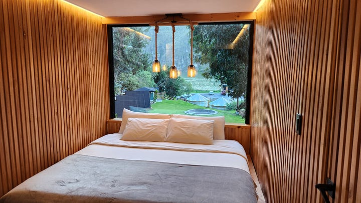 自驾游第二天没有事先计划,临时寻找住宿地时困难重重。正当焦头烂额之际,地图显示附近山里有一个现代风格的“豪华露营”(glamping)地。那是近些年流行起的新概念,在旅游热点设置固定的大帆布帐篷提供标准卫浴的旅馆式“露营”。匆匆赶到那里,分配到的却不是大帐篷,而是由集装箱改装的客房。虽然狭小,却也五脏俱全。