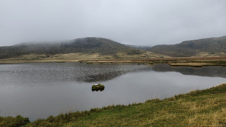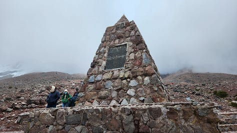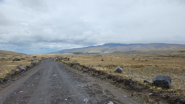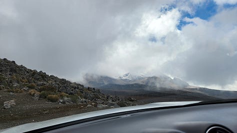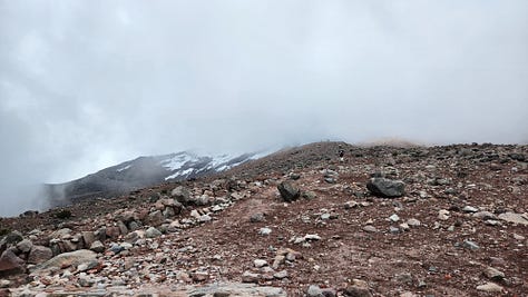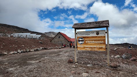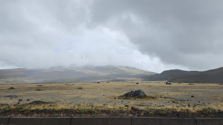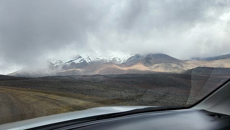 公园内只有一条路,直接通往设在海拔4800米处的卡洛尔营地(Refugio Hermanos Carrel)。驱车上行,渐入云中。近在眼前的钦博拉索山反而更难见其真面目。