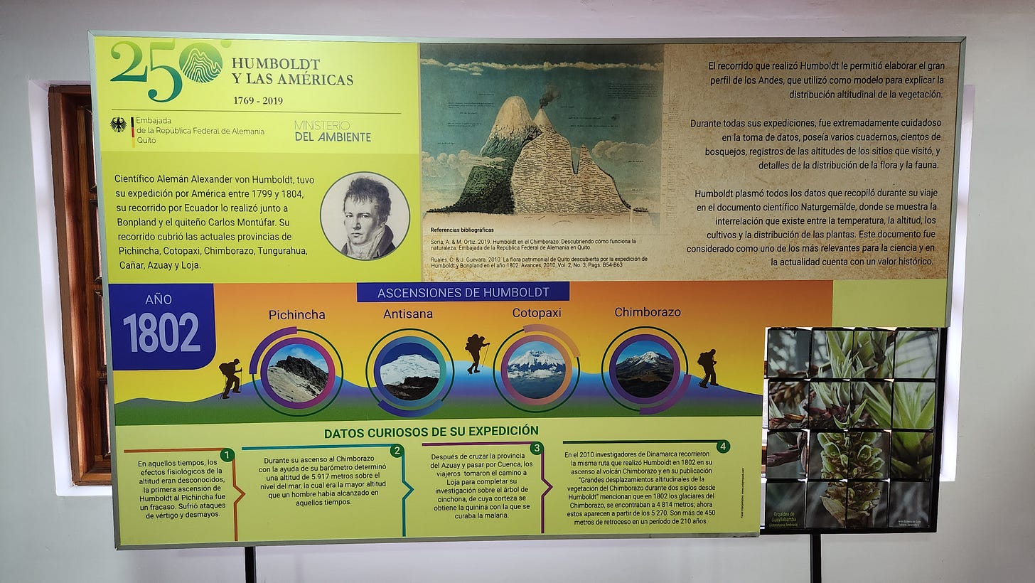 今日的科托帕希和钦博拉索火山都是国家公园,入园需要登记备案但不收费。科托帕希公园相对大一些,小巧的游客中心里有关于洪堡攀登火山的介绍。