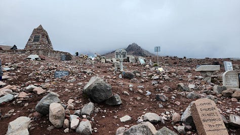 营地停车场上方的山坡上散布着墓碑,埋葬的大多是不幸在登山时遇难的勇士。十一月初是厄瓜多尔纪念死者的“清明”,已经有一些人专程来为亲朋献花、默坐和祈祷。墓园里还有一个显眼的石头金字塔,纪念革命家、“南美洲解放者”玻利瓦尔(Simon Bolivar)。他并没有在此辞世或长眠。出生南美的玻利瓦尔年轻时在巴黎留学,与洪堡结为好友。他在后者影响下重新认识自己的故乡,走向革命生涯。1822年,玻利瓦尔在钦博拉索山附近做了一个怪异的梦,写下《我在钦博拉索山上的精神紊乱》3长诗,与这座山结下不解之缘。