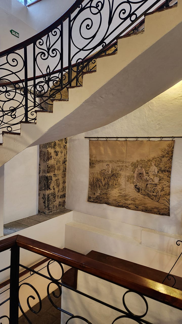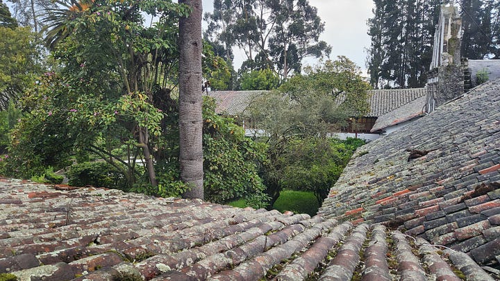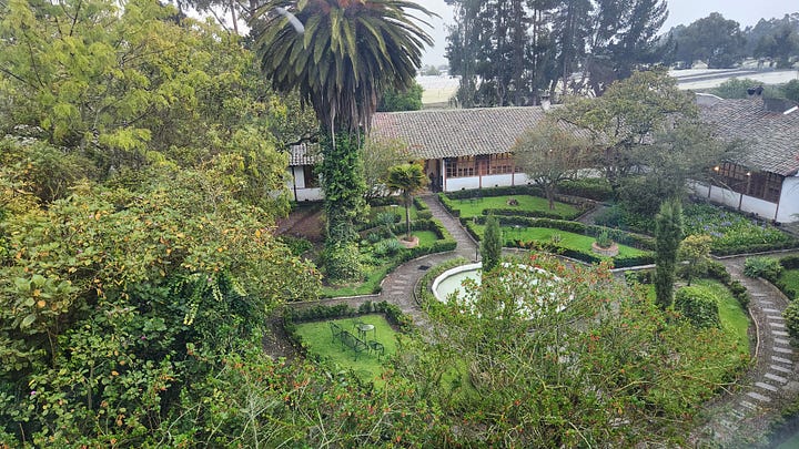 离开基多后的第一晚住在事先预订的拉谢内加庄园(Hacienda La Cienega)。法国远征队1735年来到时,这个毗邻科托帕希山的庄园刚建立不久,热情接待了远方来客。洪堡后来也在这里下榻良久。他在楼顶进行天文观察,以庄园为基地遍访附近的火山及周遭地区。三百年后,占地甚广、内有自己的餐馆、宴会厅、花园、教堂、马厩及跑马场等设施的庄园被改造为旅馆,仍然保留昔日的风情。长长的回廊里装饰着年代已久的画作、照片和劳作生活用具。房客在回廊的沙发上悠闲地品尝下午茶,欣赏窗外的花园。会客、休息室和客房里保留着硕大的老式壁炉,熊熊火焰带来昔日的温暖。卧室和的家具摆设古色古香,洋溢浓郁的历史感。