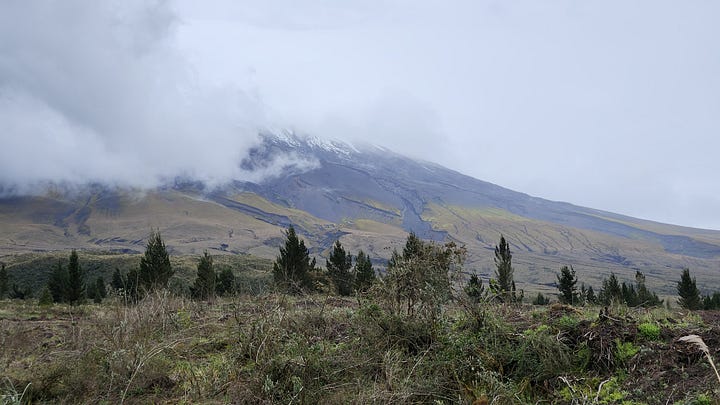 游客可以在颠簸崎岖的土路上开车绕火山小半圈,从不同角度近距离观望。一条岔路通往山脚下的营地。从那里可以徒步登顶,但要求有专业导游带领。天公还是未能作美。这天在山下只能在云雾间瞥见科托帕希一角。去营地的路上白茫茫一片,能见度随海拔增高不断下降,终究半途折返。
