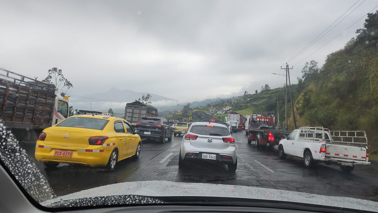 厄瓜多尔人说西班牙语,通晓英语的不多。然在语言之外,这里相当地“美国”。美元是官方通用货币,电源插座也与美国一致。即便使用国际单位制,汽油也还是以“加仑”(gallon)计量。这些细节让没什么时差的美国游客宾至如归,也为自驾游提供便利。即使在深山里,事先下载的谷歌(Google)地图驾轻就熟地导航,只偶尔出点小差错。唯一一次措手不及是谷歌地图居然不知道科托帕希国家公园的入口所在,需要自己寻找路牌。