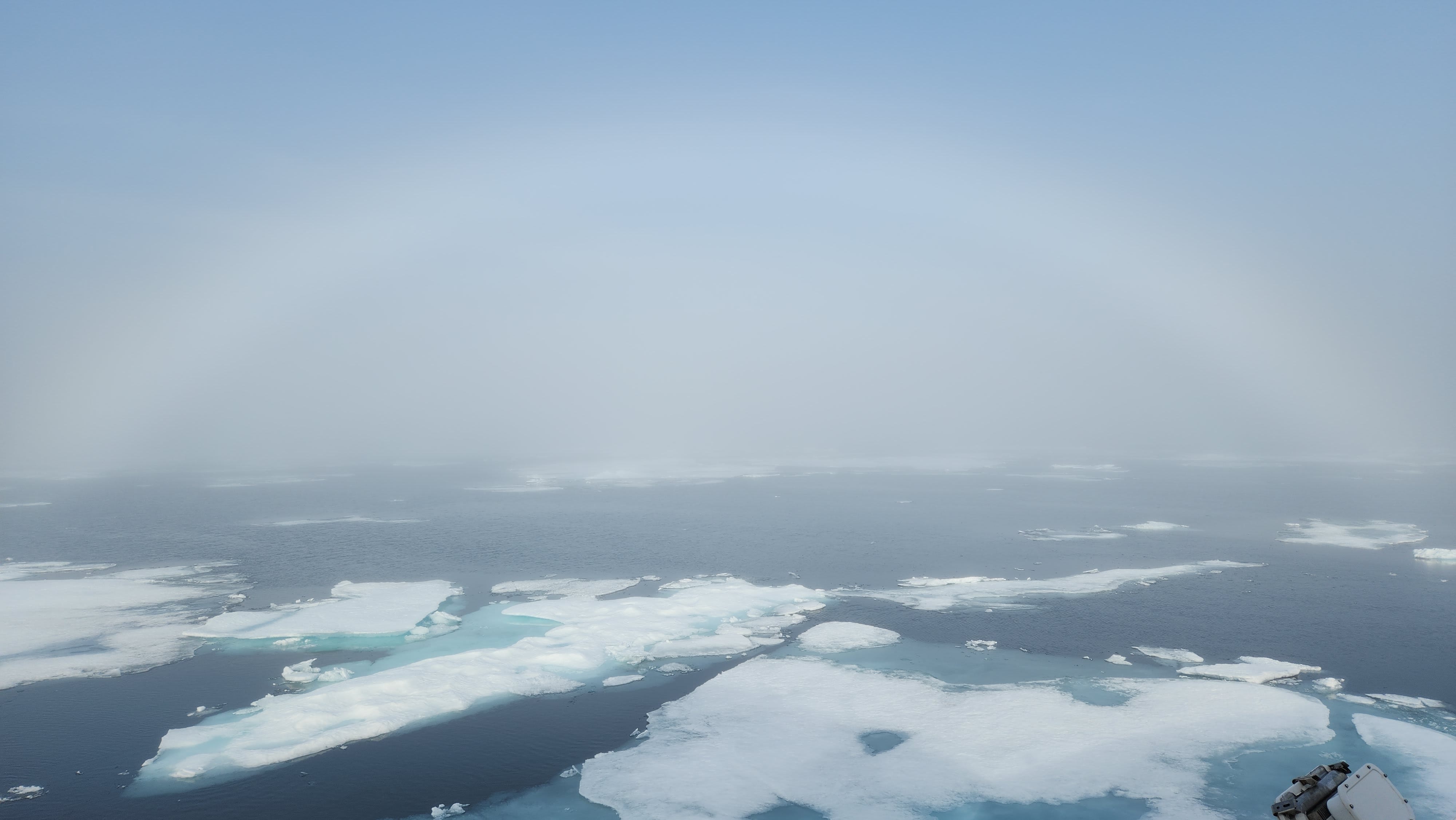 海面之上浓雾弥漫,间或出现惨淡的雾虹。那是与彩虹同样的自然现象。雾中的水滴或冰晶非常小,直径只有雨云中水滴的二十或三十分之一,不足以通过折射将白光分解为七彩的虹。