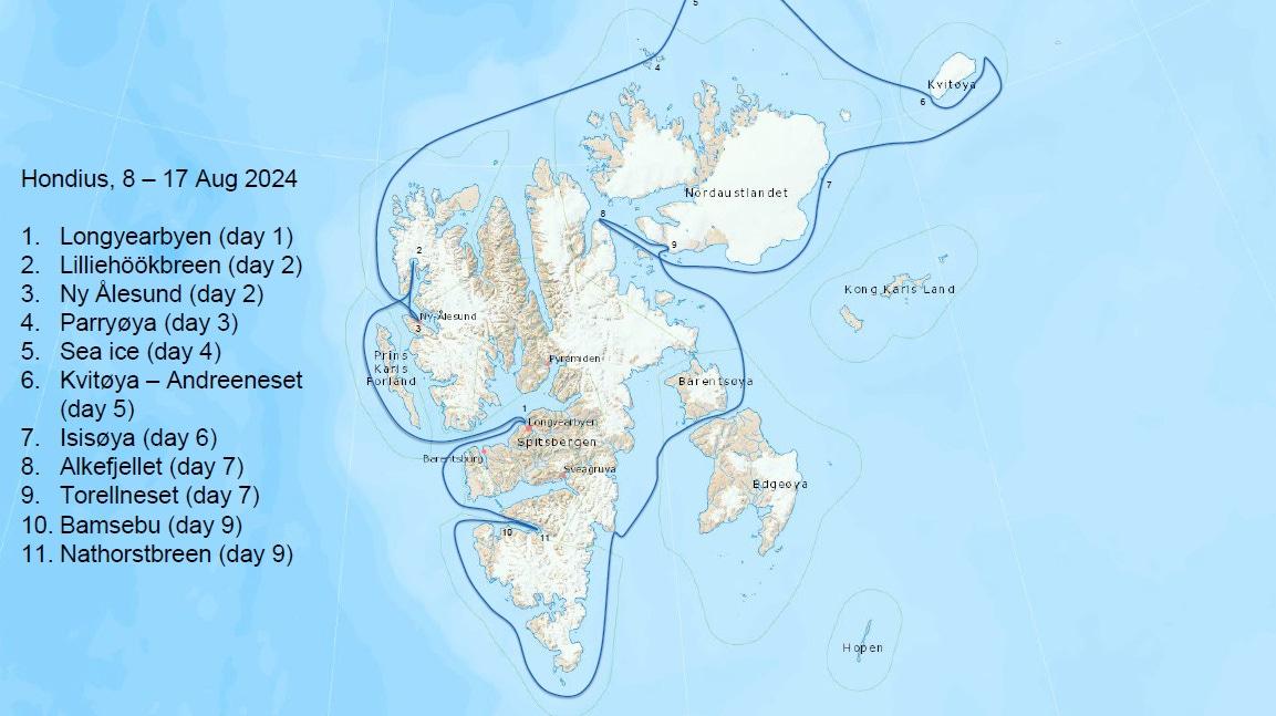 笔者来此即为乘坐“远洋探险”(Oceanwide Expeditions)公司的邮轮。这家公司专长在地球南北两极的特色旅游,主要运营游客数目不到两百、为应付冰块特别加固的小型邮轮。这些邮轮在夏冬两季分别在北极和南极附近巡游,为乘客带来可能是一辈子只能一次的经历。本次邮轮行共九天,有一个鲜明的主题:“在北极熊与冰的王国”2。为追逐冰和北极熊,船长和探险队长随时根据天气和野生动物状况改变行程和计划,但总体上还是几乎完整地环绕斯瓦尔巴群岛,时常深入其中的海湾。