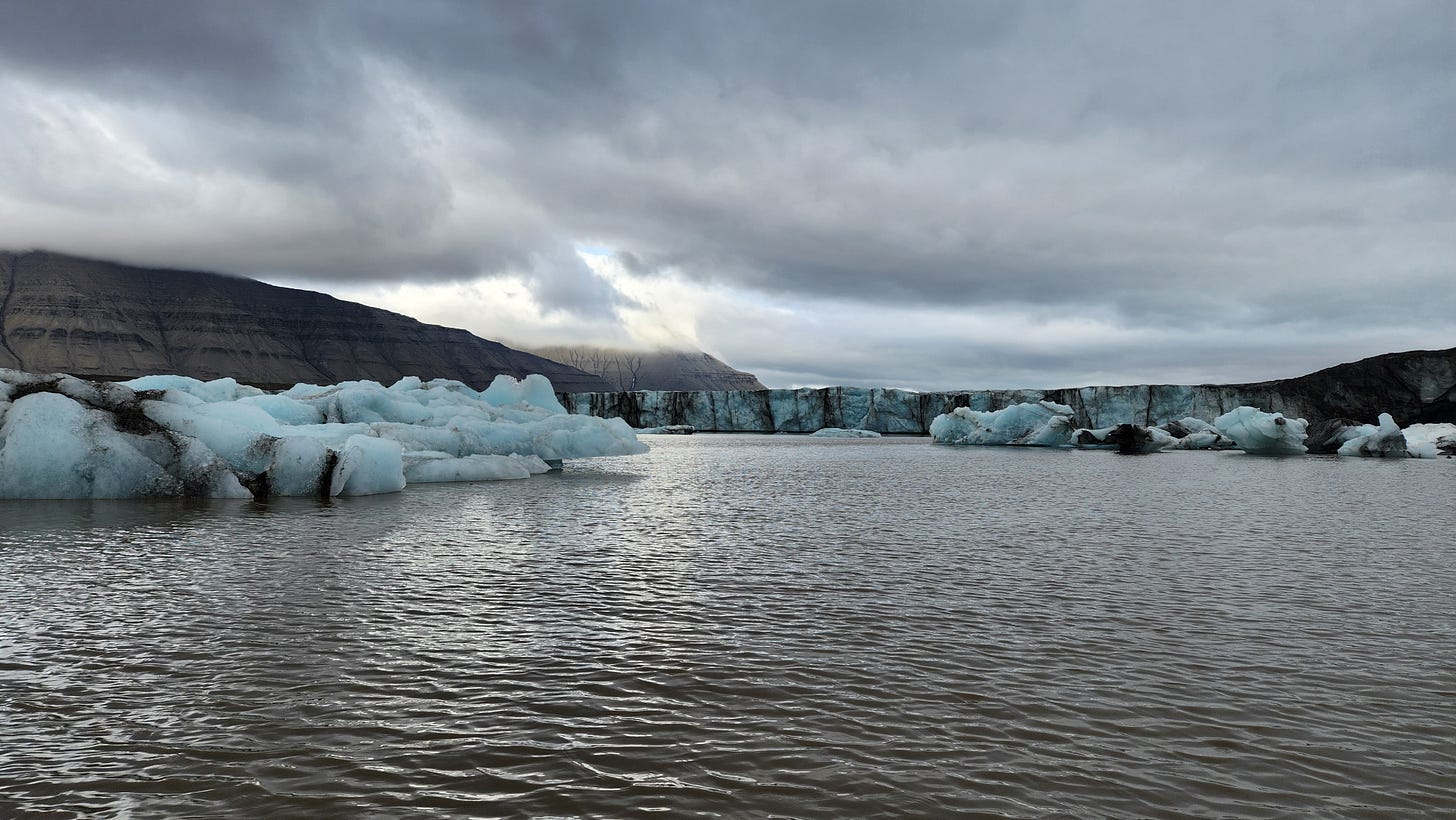 在邮轮或冲锋舟上及在岛上徒步接近冰川时经常能听到其内部空气被挤压逃逸时的爆裂声。遗憾的是未能目睹巨型冰块从中坠落的场景,只得见水里漂浮着形状各异的小“冰山”。