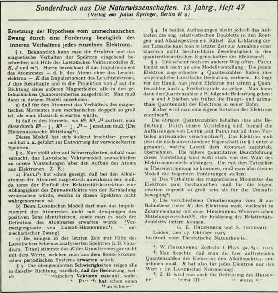 古德斯密特很为师弟的物理直觉震惊。他们俩很快做了一些计算,写就一篇不到一页纸篇幅的论文。在埃伦菲斯特的提议下,古德斯密特同意打破按姓氏字母排序的惯例,让乌伦贝克做了第一作者。埃伦菲斯特一边寄送论文,一边让他们也去请教一下德高望重的洛伦兹。