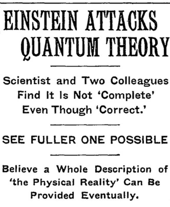 这篇报道的标题部分便提纲挈领地归纳了其全部内容:“【爱因斯坦】与两位合作者发现【量子理论】虽然‘正确’却还没有‘完备’”“【他们】看到存在更完备理论的可能”、“相信一个‘物理现实’的完整描述终将出现”。