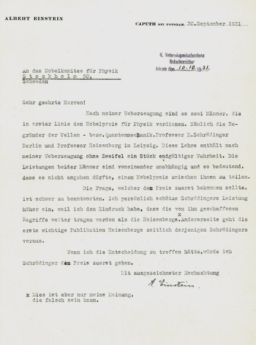 很少参与诺贝尔奖提名的爱因斯坦最早在1931年10月致信委员会提名薛定谔和海森堡。他在信中直言表达自己的犹豫:那两人对量子力学的贡献彼此独立,又都相当显著。他们各自都当之无愧,不应该只是分享荣誉。但爱因斯坦却难以定夺哪一个更应该先得到嘉奖。他认为薛定谔的波动方程更有前途,因而是更高价值的成就3。但在理论的突破上海森堡显然早于薛定谔,拥有优先权。最后,爱因斯坦决定:如果由他做主,他会把奖先发给薛定谔。