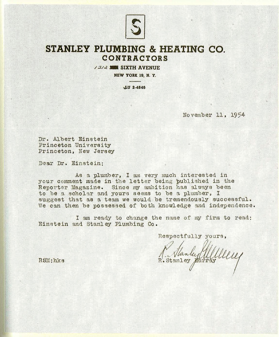 1954年11月,身心俱疲的爱因斯坦给一家杂志去信感叹,如果他还年轻,他不会去当科学家。他可能更愿意去做一个水管工,那个职业在当前形势下比学术界更为独立、自由。信件发表后,全国各地的水管工纷纷来信,热情邀请爱因斯坦加盟。