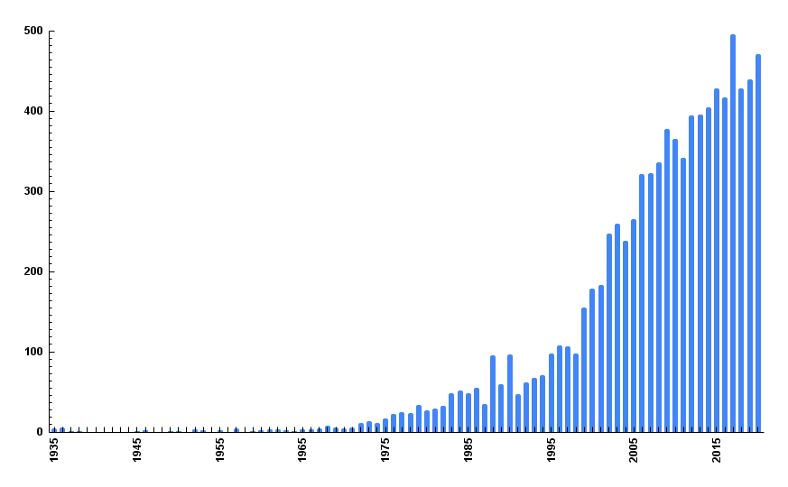 还是因为玻姆、艾弗雷特的异军突起,EPR论文才在1950年代开始又有了零星的引用,逐渐在贝尔的不等式引起关注后的1970年代初达到两位数。但在1980年代,这篇已经有半个世纪历史的老论文却有了每年被引用约50次的不俗表现。