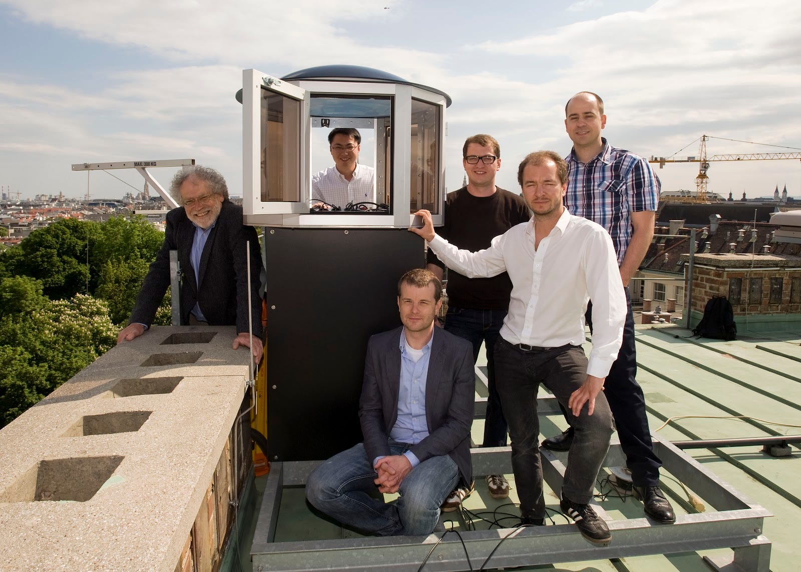 因施特劳斯(Johann Strauss II)圆舞曲名闻天下的多瑙河在市内流过。当塞林格带着他的学生们来到这个烂漫、热情的旅游胜地时,他们却一头钻进河边不起眼的小楼。楼里的电梯直达地下横穿河底的城市排污管道,那正是铺设输送光信号电缆的现场通道。他们在岸边和河心岛的两个这样的小楼里安装起测量仪器,开始走出象牙塔的第一个量子实验。