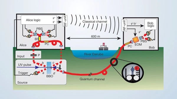 这样,量子纠缠在2003年成功地跨越了多瑙河。由“自发参数下转换”产生的光子对在这个距离和环境中保持了彼此纠缠的量子态,也顺利完成量子的隐形传态,证实量子通讯的实际可行性。