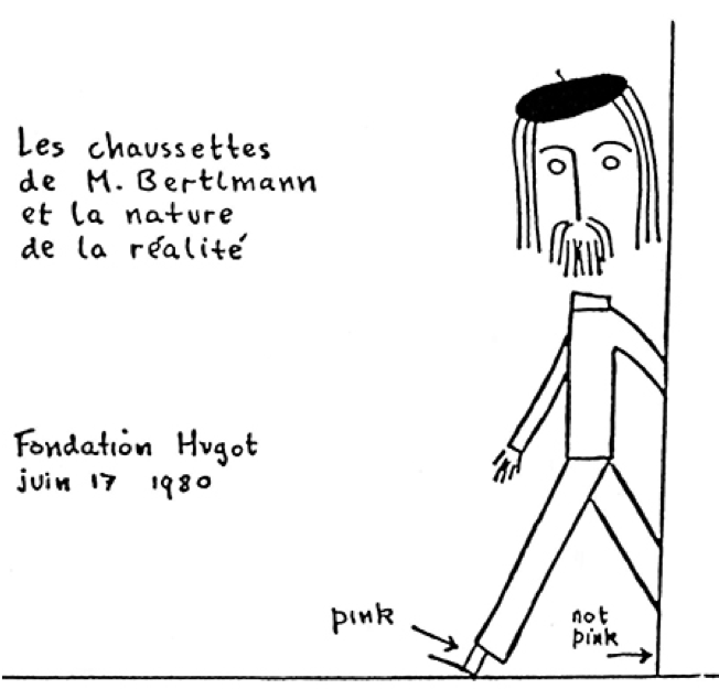 贝尔专门绘制了一幅草图。图中的伯特曼正气宇轩昂地走来。他迈出的左脚已经进了门,裤腿下露出一小截袜子。贝尔标记那是一只“粉红”的袜子。伯特曼的右脚还留在门外看不见。贝尔用箭头指明那只脚上的袜子肯定“不是粉红色”。
