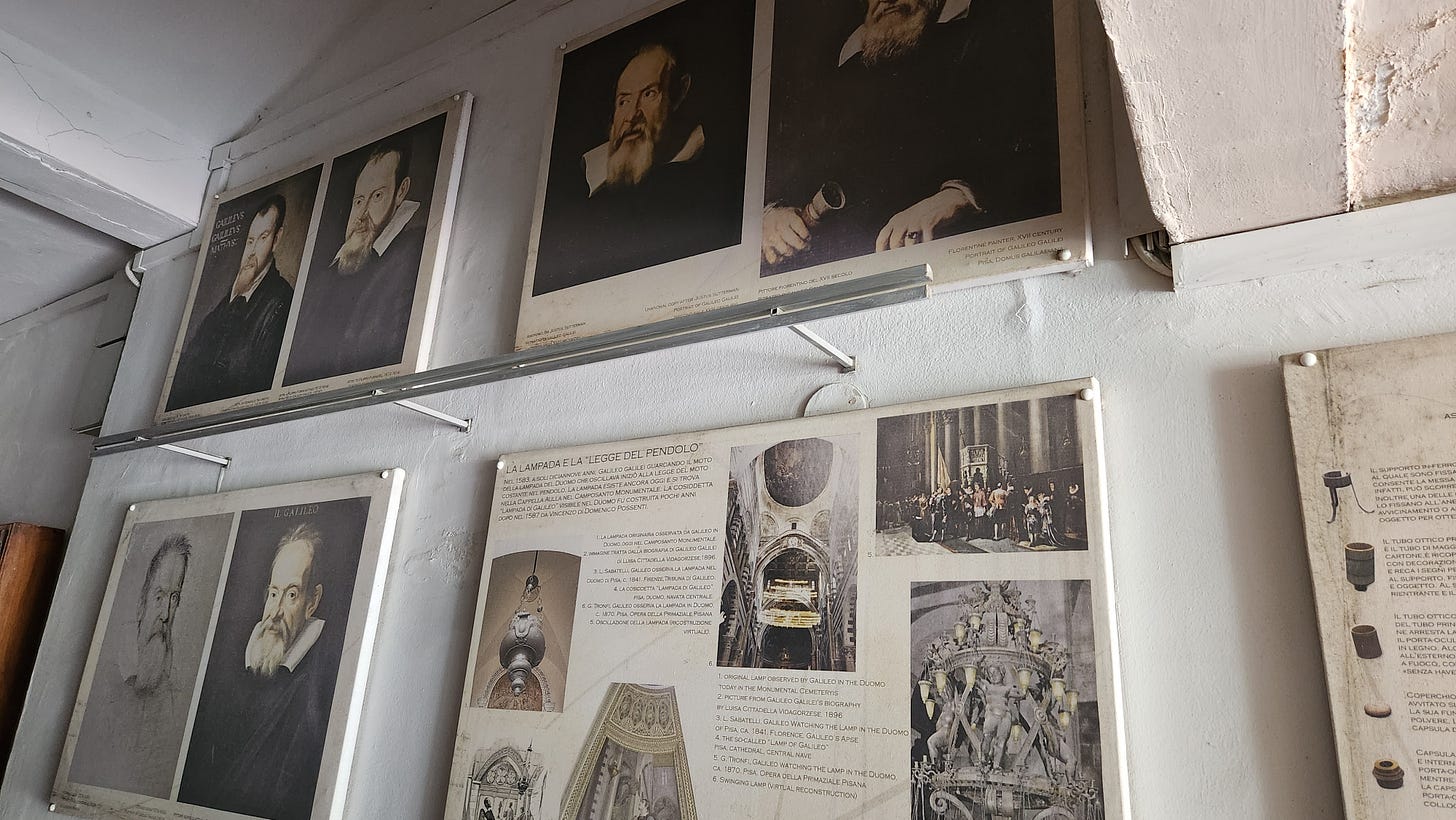 房屋的外门开着,里面走廊上有一排介绍伽利略生平的板报。它们看似来自某个展览项目,已经很有年头。