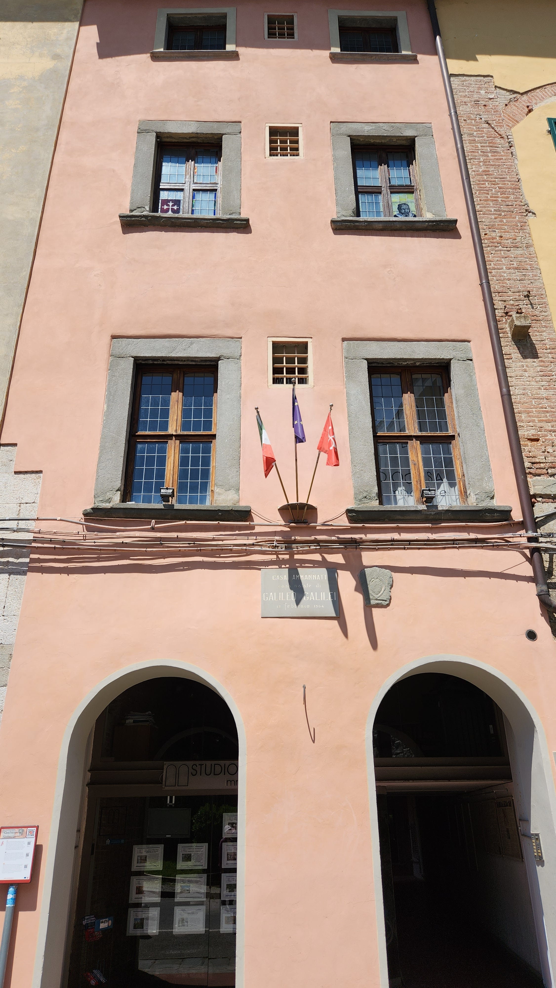 伽利略在1564年2月15日出生于比萨,具体的出生地点却不那么确定。19世纪中期的学者将之定位于阿诺河畔的一间民居,认为那曾是他母亲拥有的住宅。今天那间房前有一个正式的铭牌,标志着伽利略的出生地有了定论。