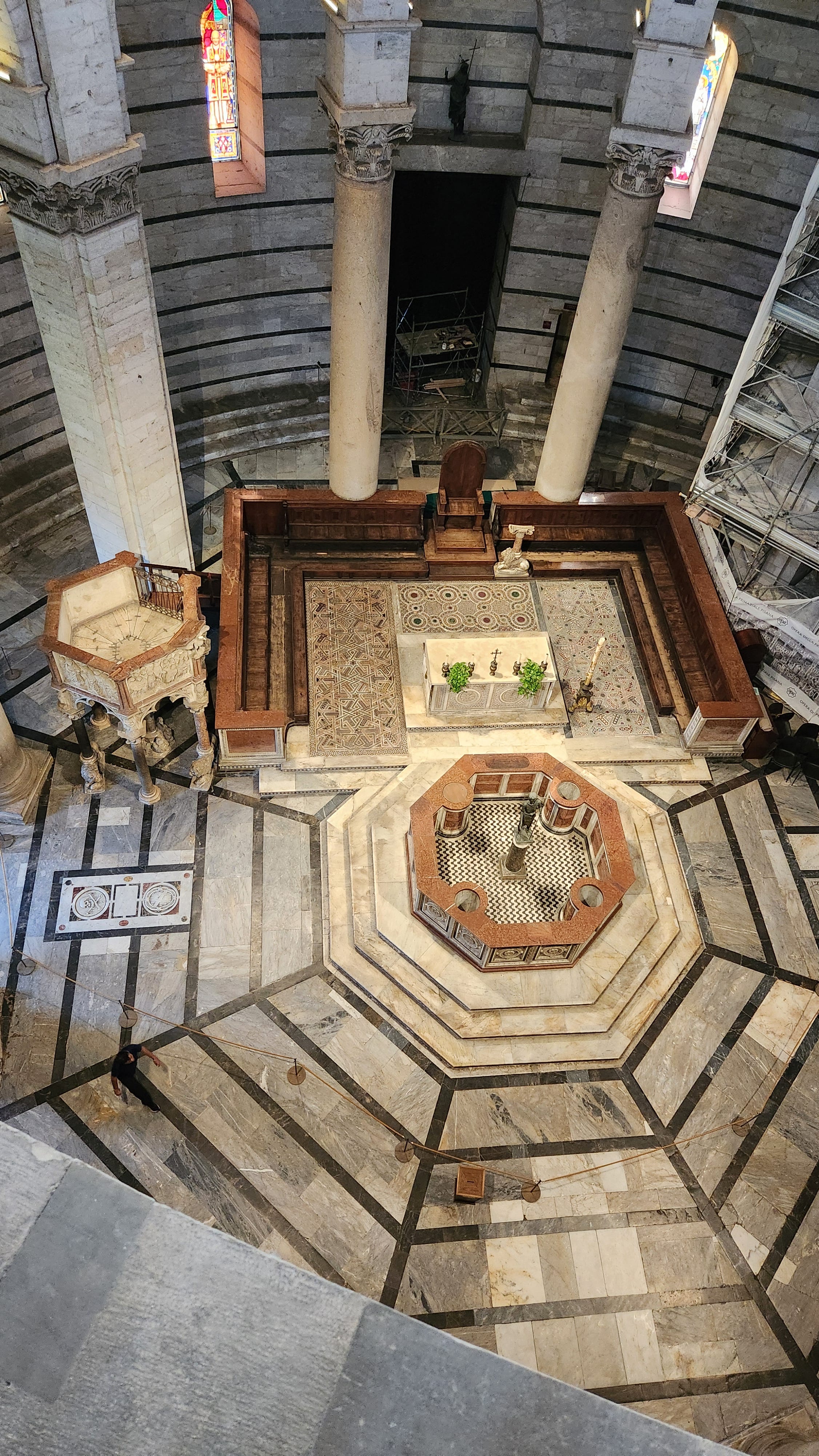 作为教堂附属的钟楼,斜塔其实只是那个“奇迹广场”中最不重要的建筑。广场内另有洗礼堂、大教堂和墓园,是比萨有身份的信徒从出生受洗到死后埋葬的人生全部寄托。伽利略在出生的四天后在这里的洗礼堂受洗。据介绍,他的受洗证明收藏在附近的博物馆里。不巧的是该博物馆正值修缮,未能得见。