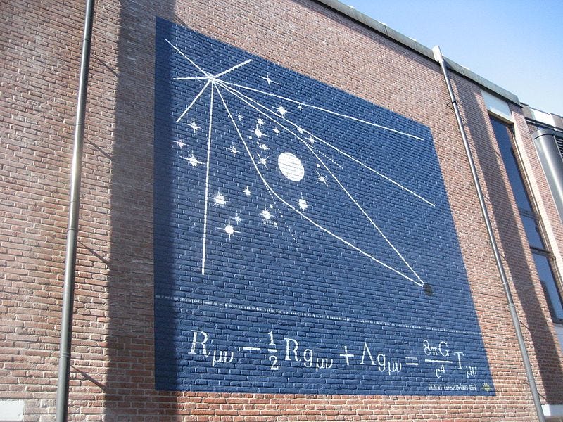 爱因斯坦写出的广义相对论场方程是一个看起来直截了当的等式:左边是描述四维时空“形状”的张量,右边则是时空中能量(和质量)、动量的分布。中间那个等号将这两个过去毫无关联的元素联系了起来。方程中没有“力”,却能描述水星绕太阳的公转:因为太阳的质量造成它附近空间的弯曲,而在这弯曲空间中的水星便自然地绕太阳转起了圈——并且比在牛顿力学中转得更为精确。